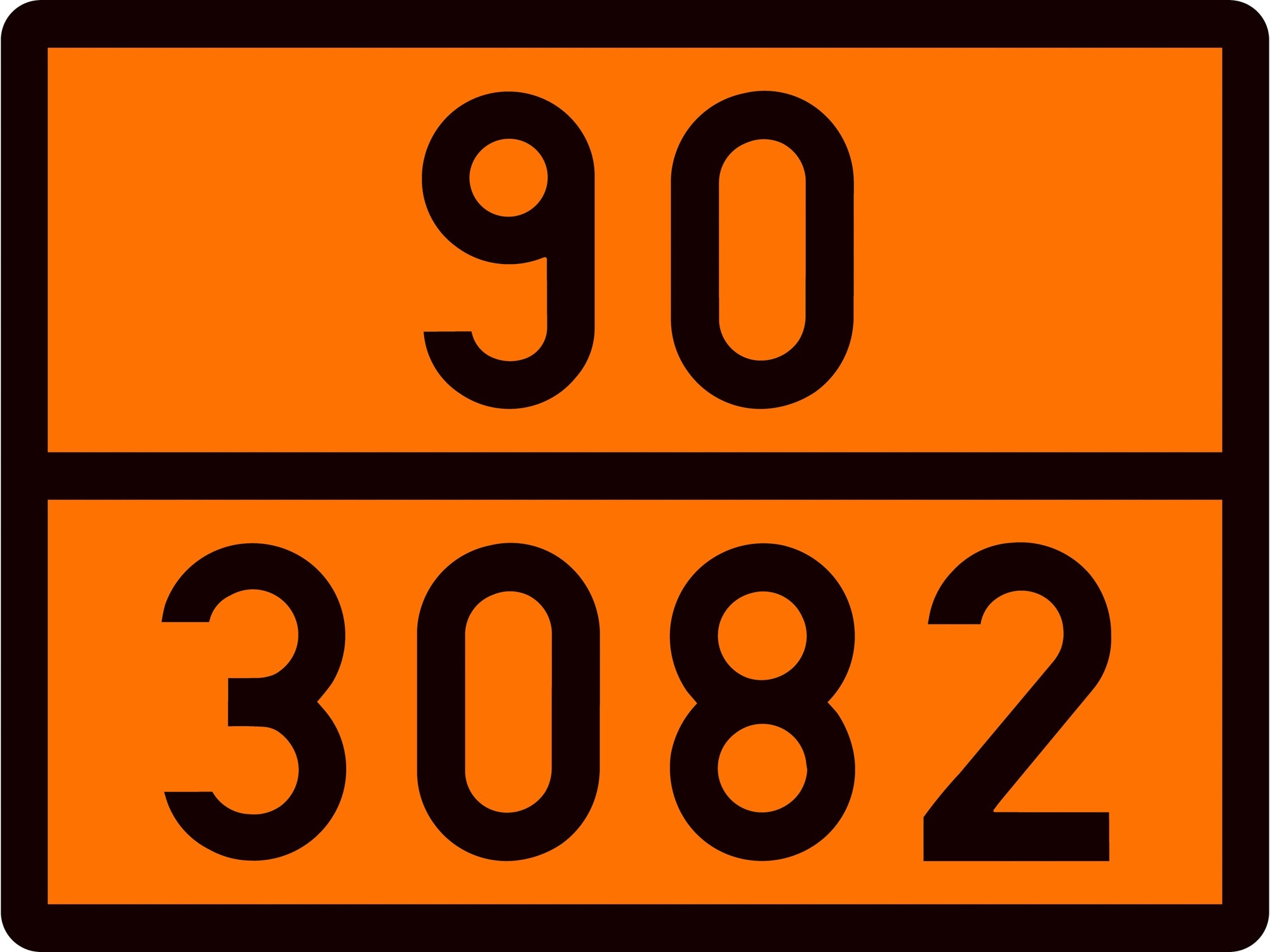 ADR-skylt i rostfritt stål med märkning 90/3082 – klassificerad för transport av miljöfarliga ämnen i flytande form. Skyltmått 300 x 400 mm. Uppfyller gällande regler enligt ADR-S.