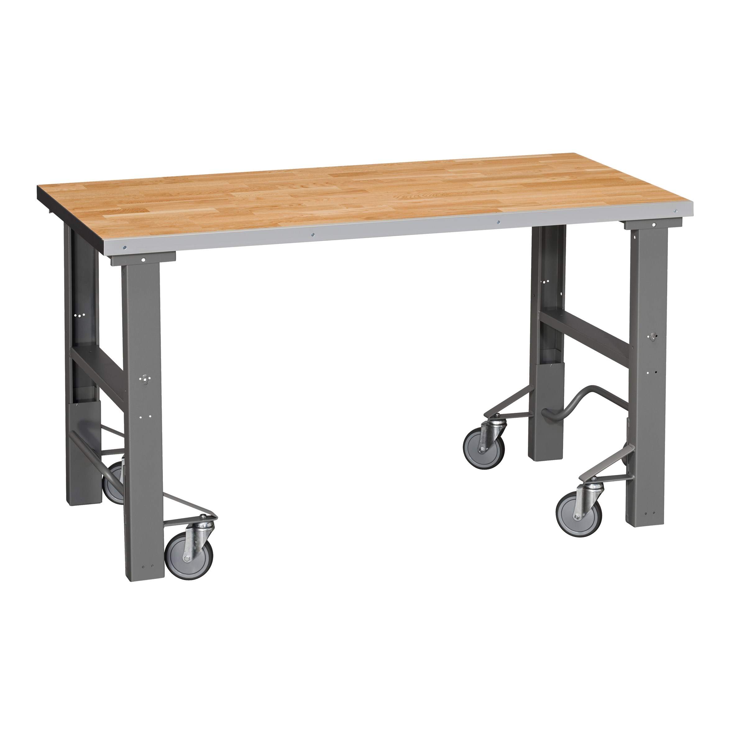En komplett arbetsbänk på hjul för verkstad, lager och industri. Detta arbetsbord är utrustad med två manuellt höj och sänkbara benbockar som stadigt och stabilt håller för vikt upp till 500kg.