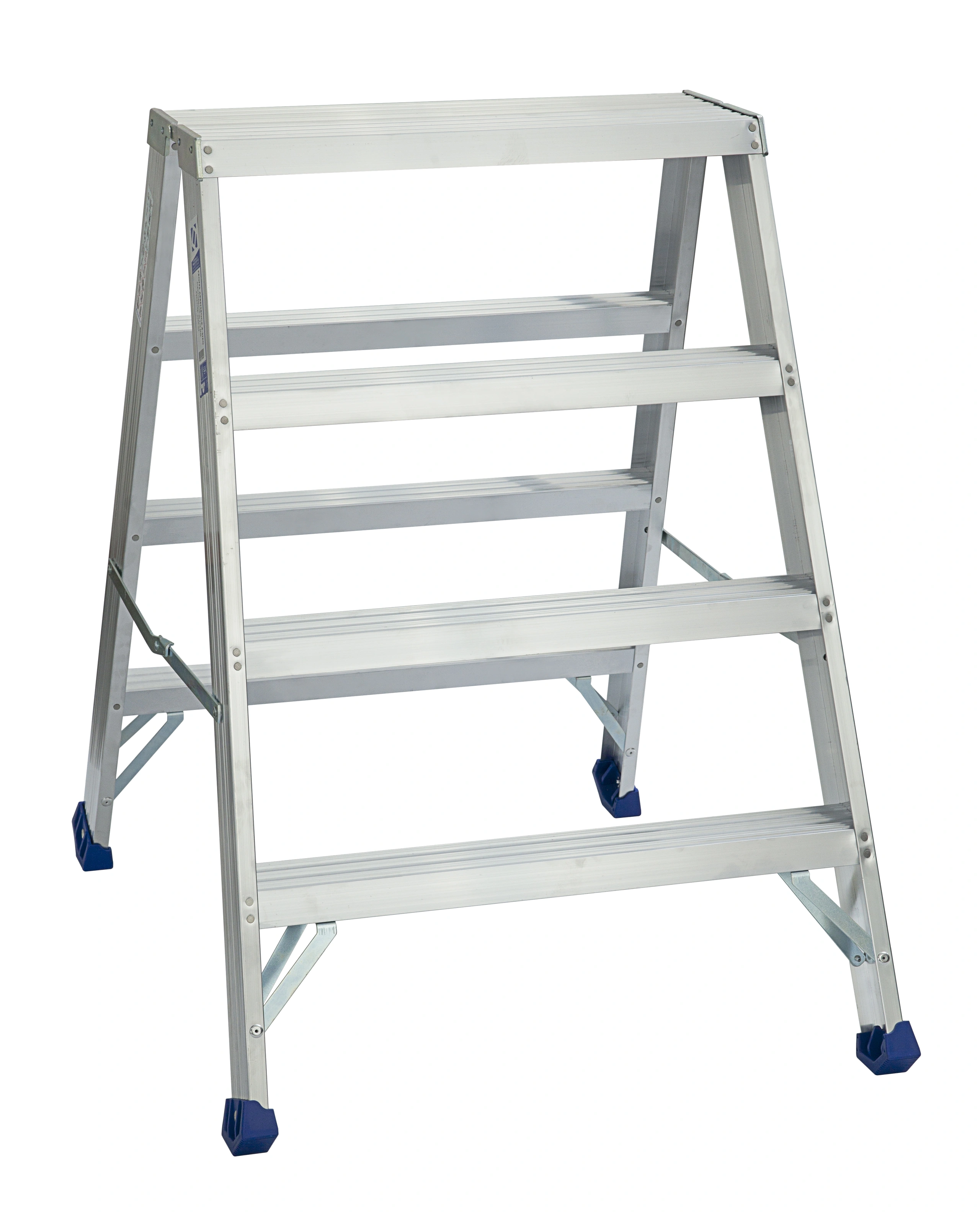 Den rejäla arbetsbocken tillverkad i aluminium. Hydraulnitade steg och plattform gör att halkrisken minskar. Arbetsbockens kraftiga glid- och golvskydd gör att den står stabilt och skyddar underlaget. Dessutom är samtliga ben förstärkta med stag mellan vangstycke och steg. Denna förstärkning ger bocken längre livslängd. Finns med olika antal steg.