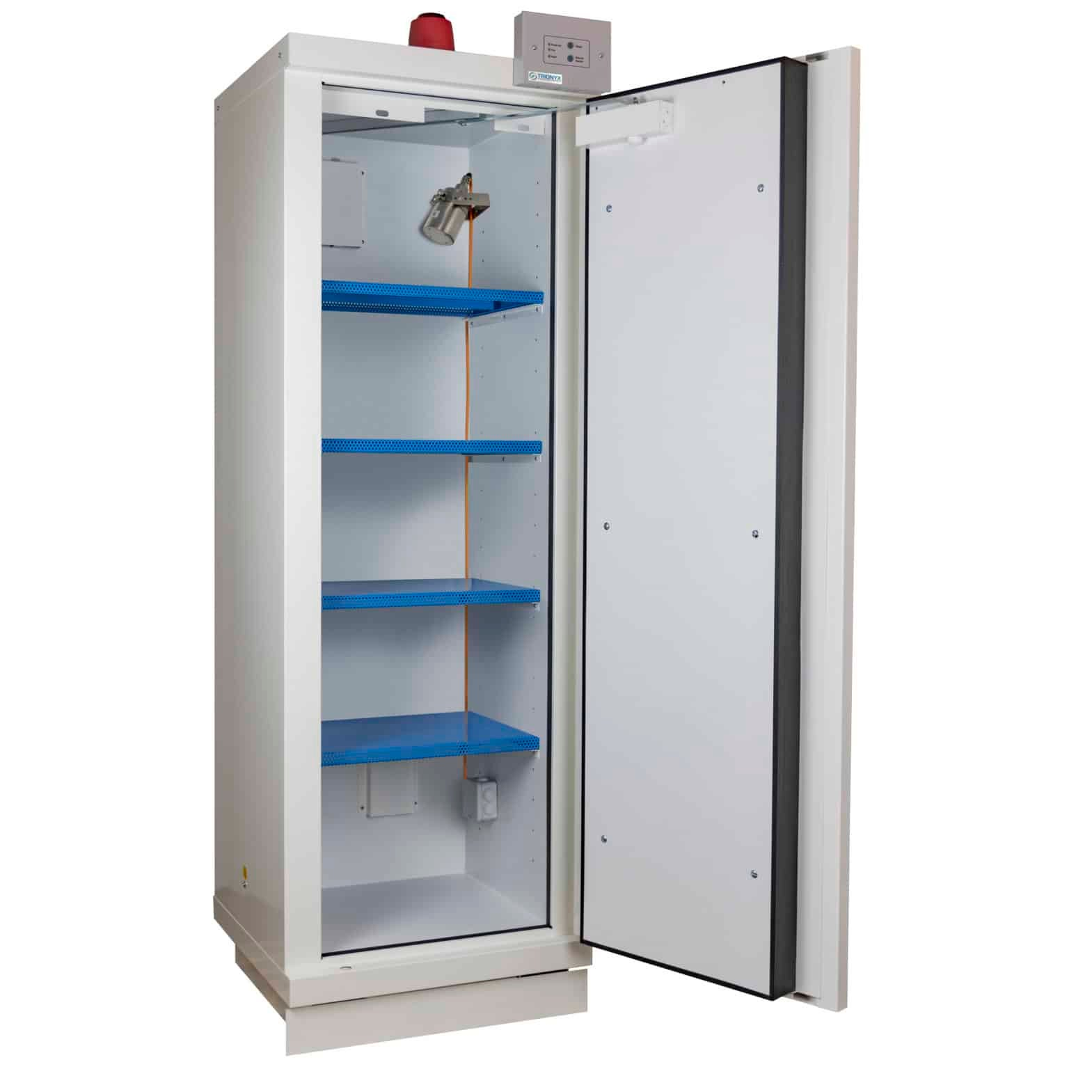 Högt säkerhetsskåp / batteriskåp med 90 minuters brandmotstånd för lagring och laddning av litium-/litiumjonbatterier för att ge minskad risk för brand och explosion. Brandmotstånd 90 minuter, enligt -1 och -1. Självstängande dörrar. Brandventilerna expanderar/tätar vid brand. Ventilationsstos i taket Ø100mm. Singnalering via standard symboler. Fixeringspunkt för jordning. Hyllorna klarar 100 kg jämn belastning. Detta skåp har följande inredning: Kontrollbox Larm med ljudsignal Rökdetektor FirePro-Brandsläckare Kabelgenomgång 4 st perforerade hyllor