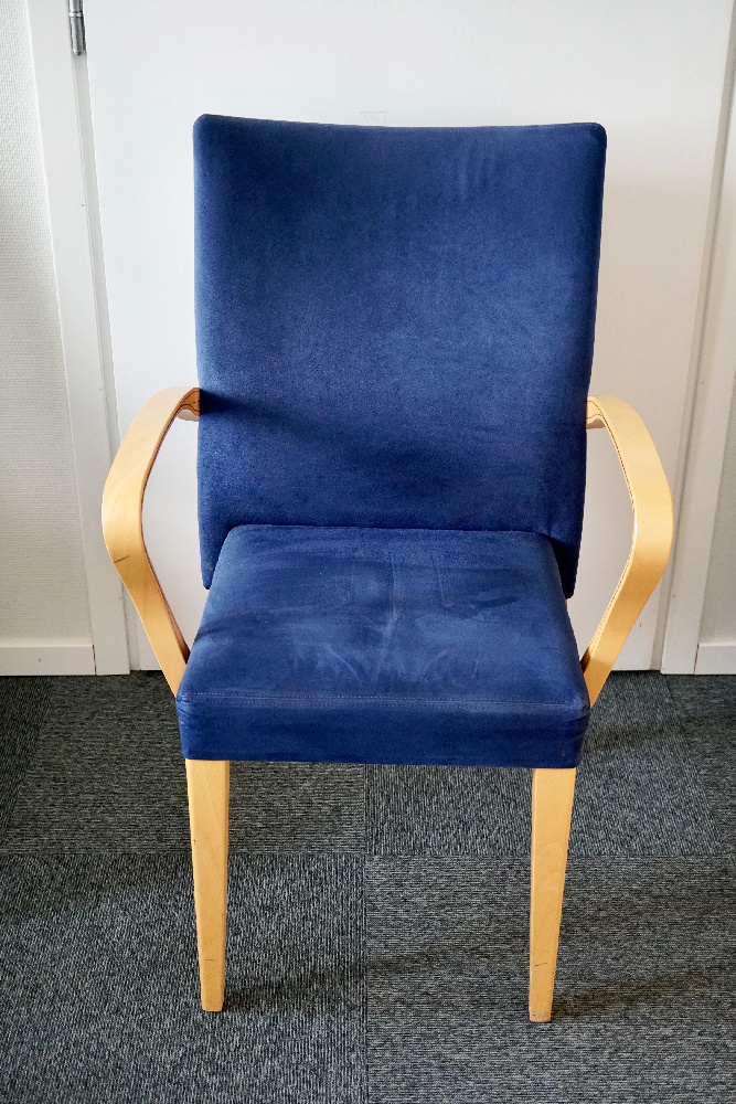 En stol som från början hör till konferensbordet, men som naturligtvis passar även i andra miljöer. Stolen har trädetaljer och ett blått sammetstyg för en exklusiv känsla.