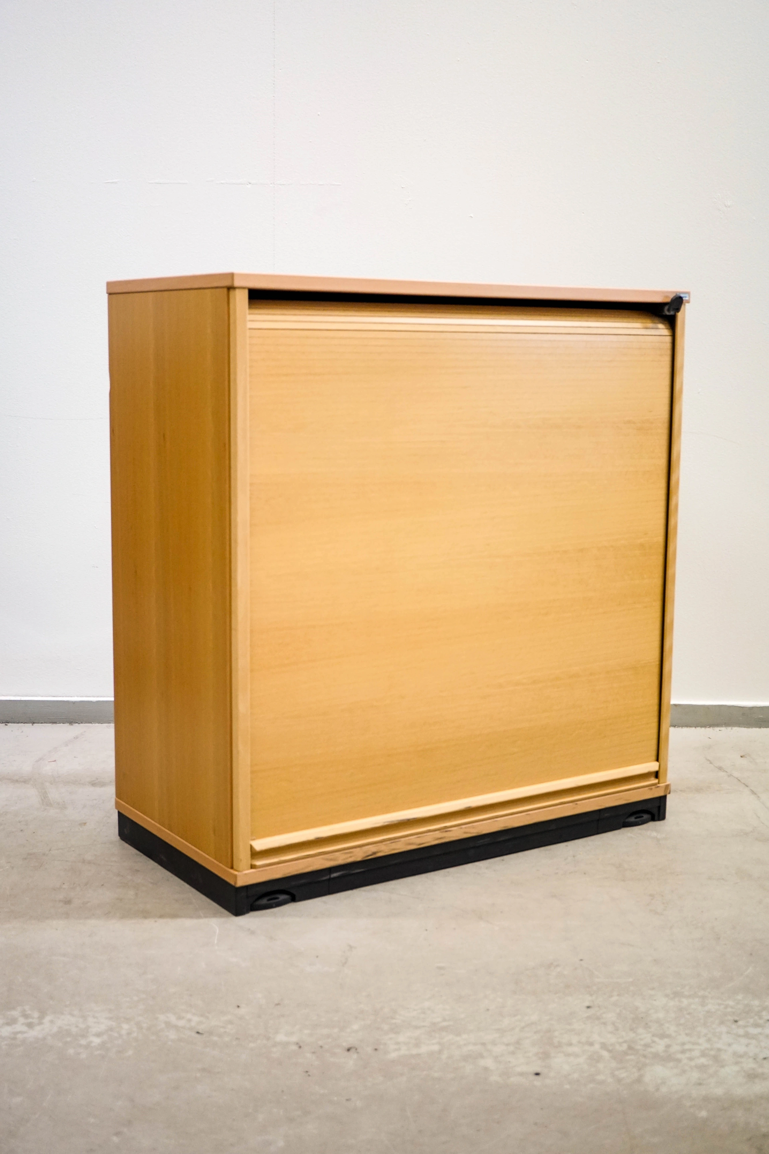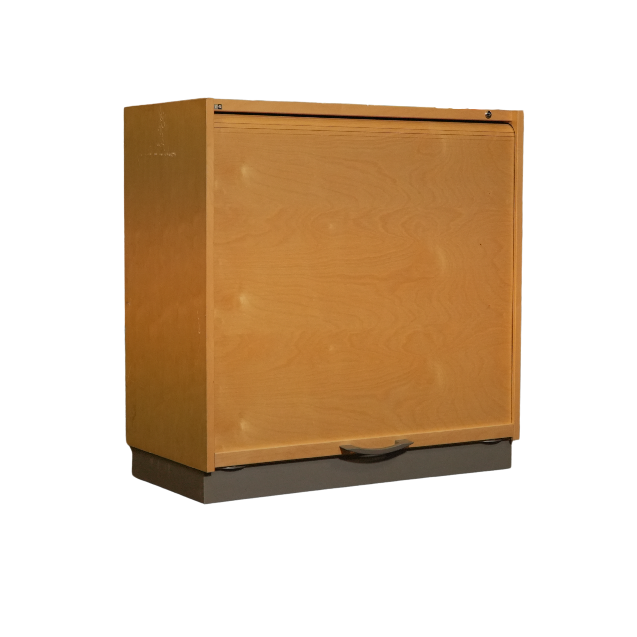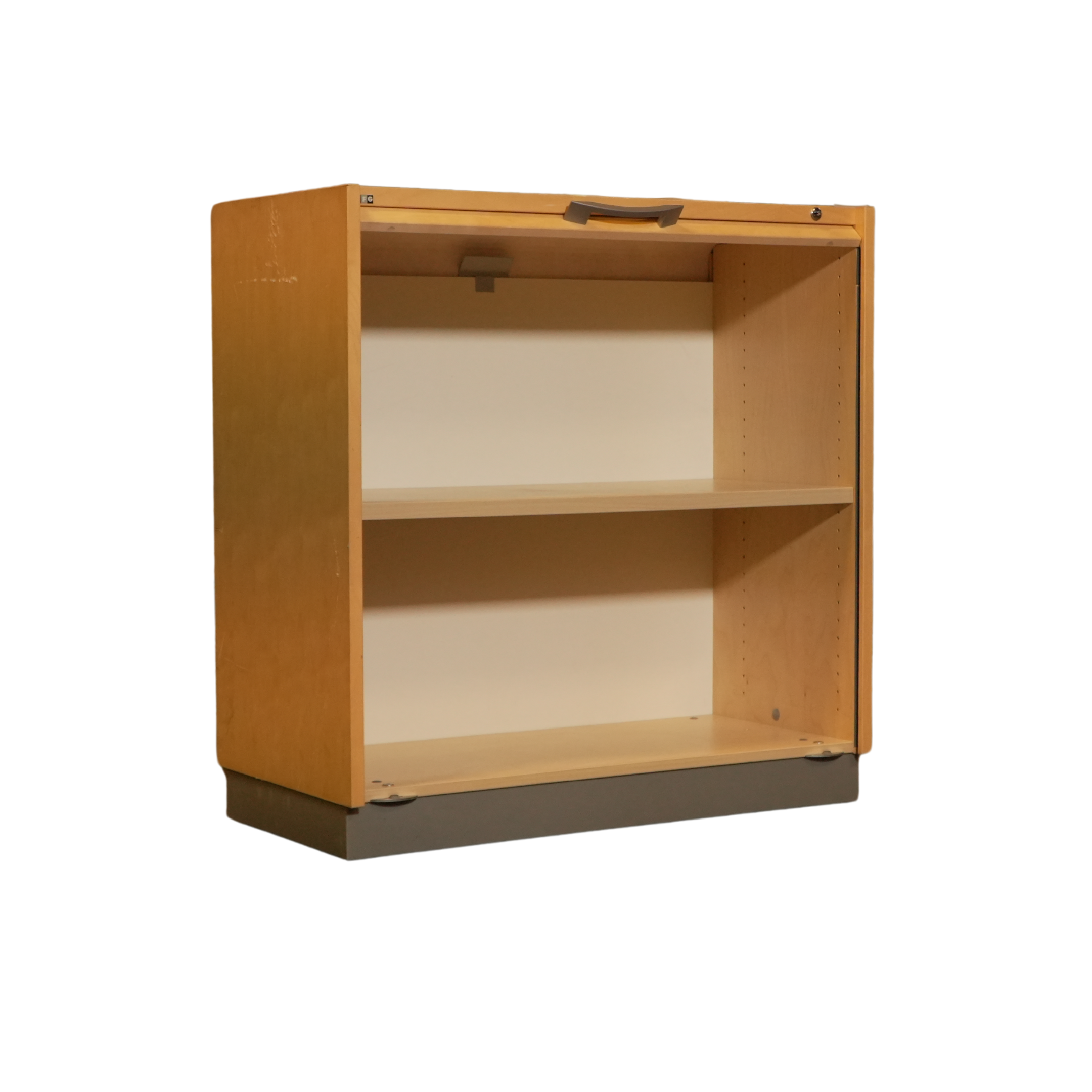 Denna begagnade pärla från Kinnarps döljer två hyllplan under jalusi. Kan låsas med nyckel för att stänga in viktiga dokument på kontor eller skola. Finns i olika utförande utan större skillnad.