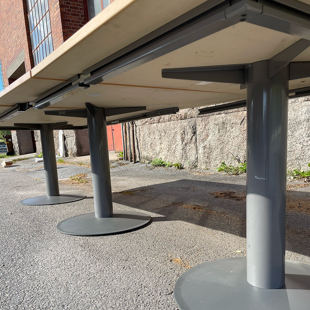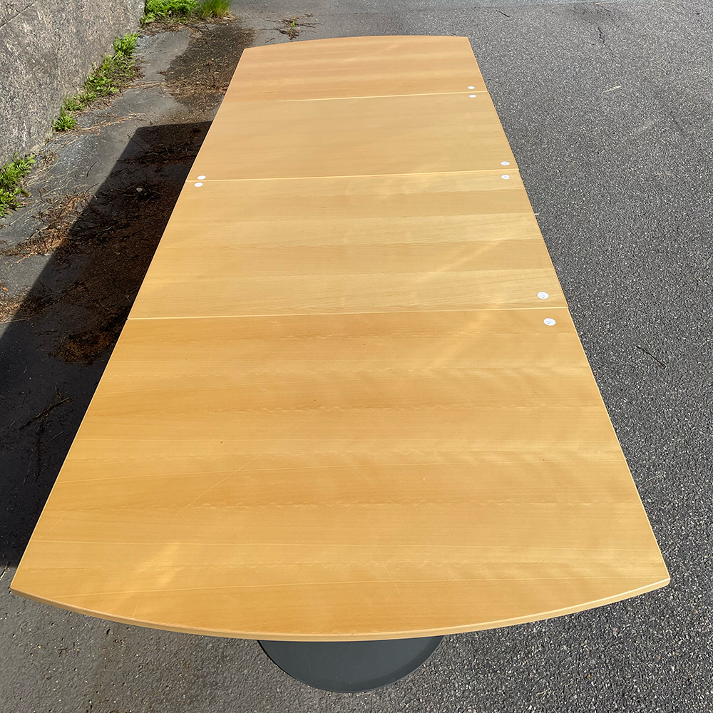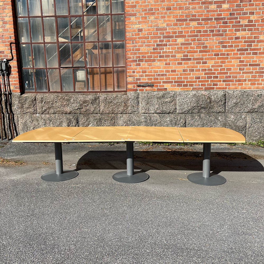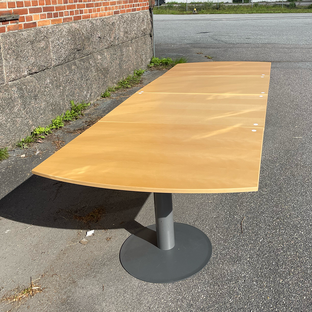 Stort och rymligt konferensbord i björk från Kinnarps. Kommer i fyra separat delar och med tre pelare i en snygg mörkgrå färg.