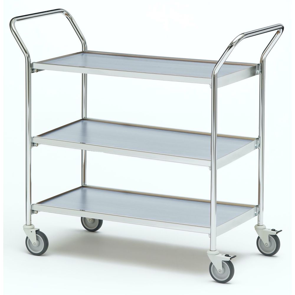 Mångfunktionell bordsvagn med tre hyllplan och två körhandtag. Hyllorna är vändbara och tillverkade i grålaminat. Vagnen har kromat chassi. Maxbelastningen på vagnen är 100 kg per hylla och totalt maxbelastning är 150 kg. Längd - 800 mm Bredd - 420 mm