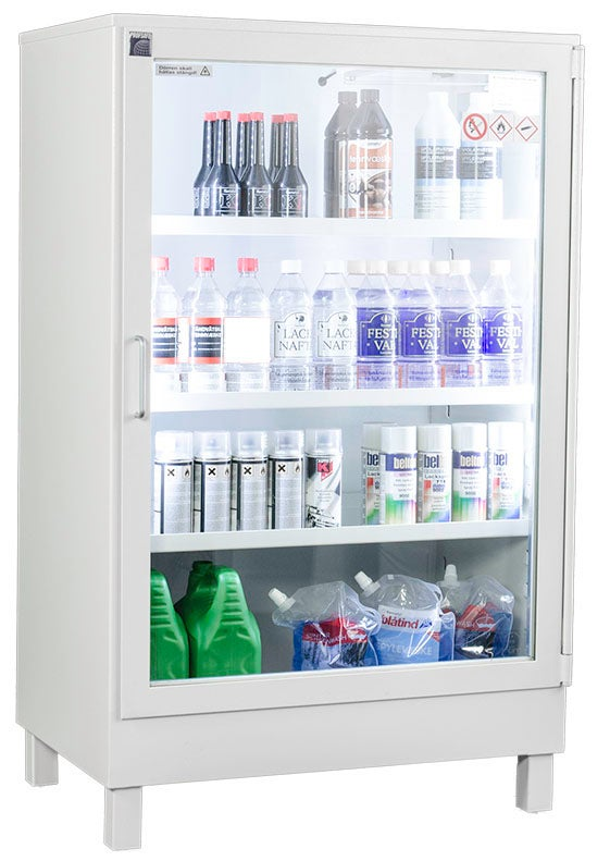 Ett smidigt och lättplacerat skåp i snygg design. För lagstadgad samförvaring av brandfarliga vätskor (version 6) t.ex. livsmedelsbutiker, stormarknader, bensinstationer, färgbutiker, byggvaruhus, frisörsalonger m.m. Skåpen är testade enligt SP-metod 2369, version 6 och uppfyller kraven för samförvaring av brandfarlig vätska och aerosoler (både plastflaskor, plastdunkar och sprayburkar) samt certifierade och P-märkta av RISE (Research Institutes of Sweden) med certifikat nr C900026. Skåpen flyttas enkelt med handtruck. Skåpen är försedda med ställbara fötter och skall vägas in efter flyttning. Som tillval finns LED-belysning för bättre exponering av produkterna. Skåpen blir lätt en del av butiksinredningen genom sina mått och enkla placering.