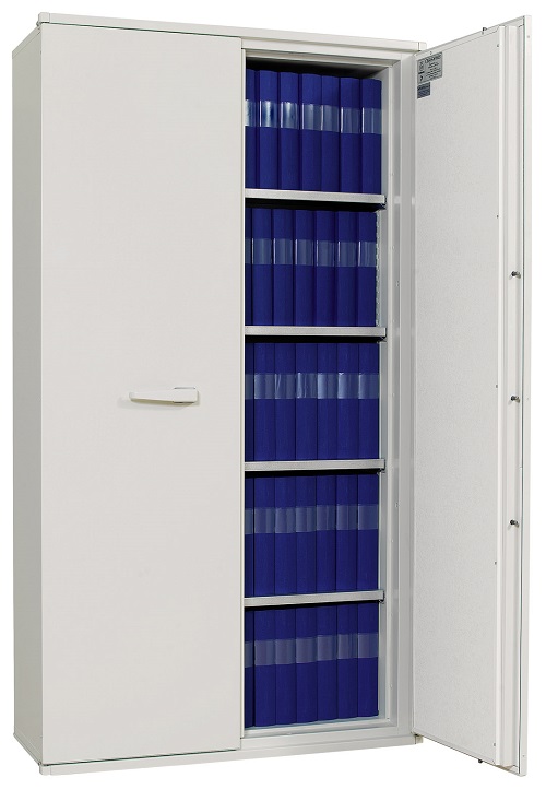 Ett funktionellt brandsäkert arkivskåp med dubbeldörrar. Skåpet är svensktillverkat och konstruerat för att fungera i det dagliga arbetet och för A4-pärmar i dubbelt pärmdjup. Det är den perfekta förvaringen för avtal, ritningar och andra viktiga dokument. Fyra flyttbara hyllor medföljer vilket ger flexibilitet och möjlighet till en anpassad utformning, utifrån varje enskild användare. Skåpet har en unik dörrkonstruktion som ger full åtkomst vid 90° vinkel på dörrarna. Det finns även möjlighet att öppna upp dörrarna helt för att få illusionen av en öppen bokhylla. Det fungerar utmärkt att placera flera skåp bredvid varandra och de tar upp väldigt lite utrymme. Skåpet kan kompletteras med mer avancerade låsanordningar för att även skydda vid inbrott och liknande. I standardutformning medföljer två stycken nycklar.
