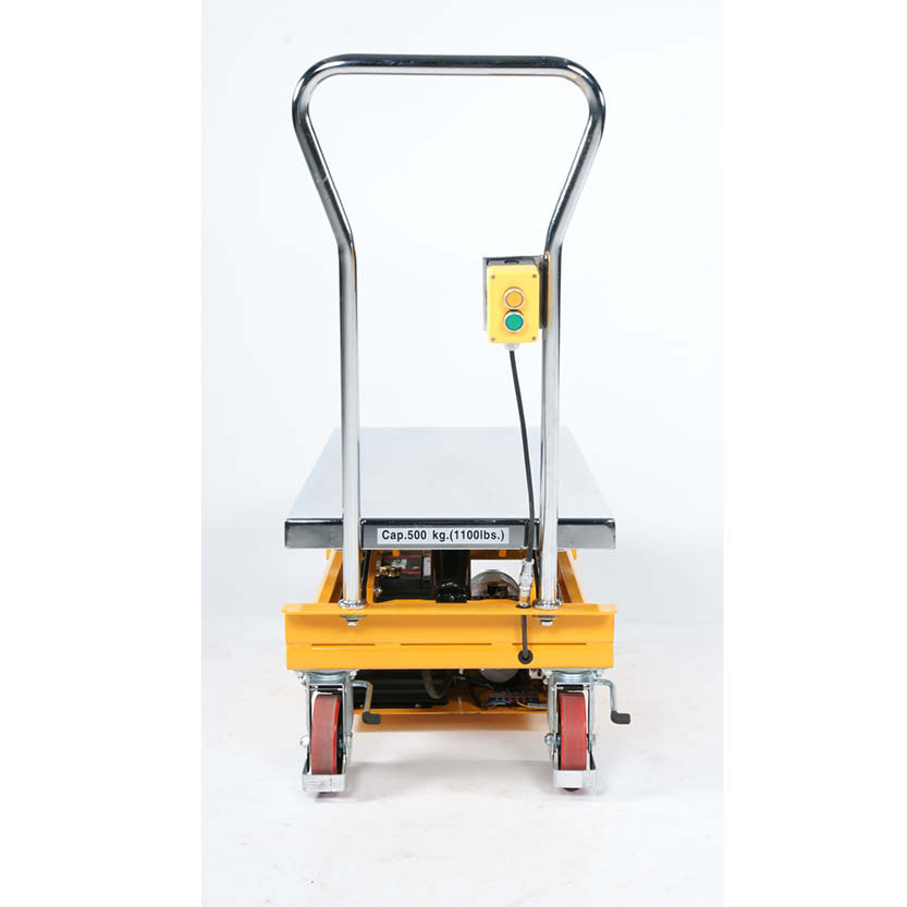 För lager- och produktionsmiljöer där gods behöver lyftas och förflyttas i samma moment erbjuder detta elektriska lyftbord med dubbelsaxkonstruktion en lyfthöjd mellan 440 och 1 025 mm med handreglage för höjning och sänkning. Lastplattan på 1 010 × 520 mm är tillverkad i 3 mm kromat stål och klarar en last upp till 500 kg. Polyuretanhjul med en diameter på 150 mm säkerställer stabil rörlighet på hårt underlag.