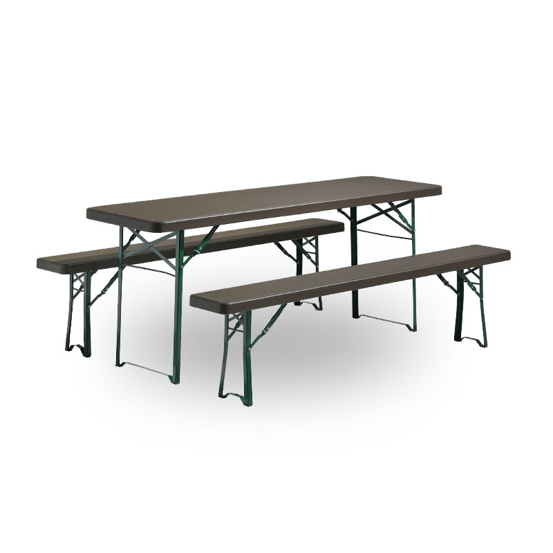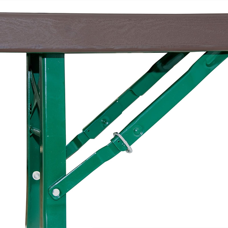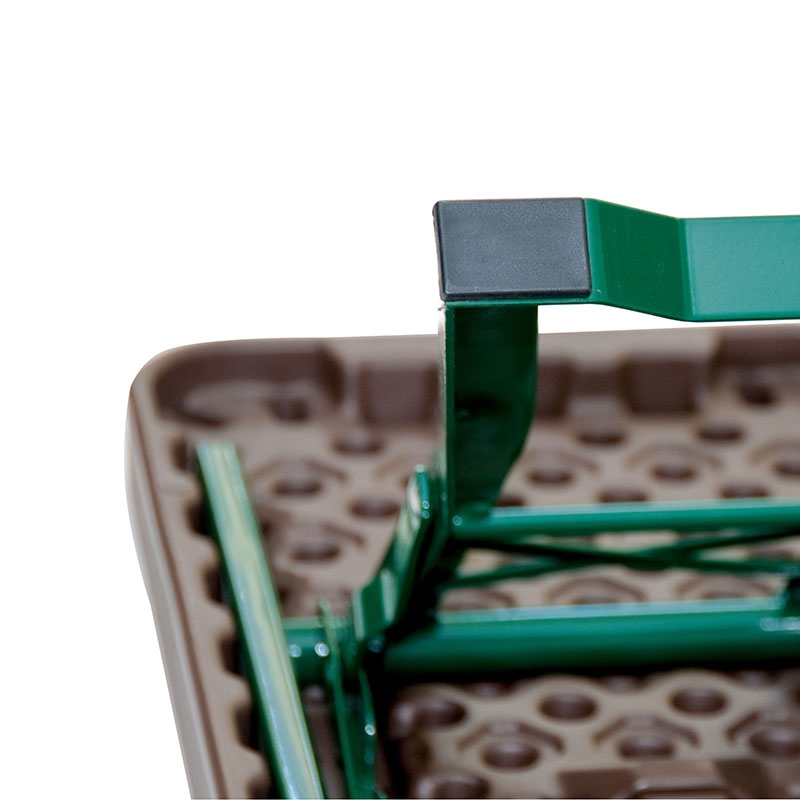 Fällbar bänk med pulverlackad struktur och en högdensitetspolyetenskiva för högsta finess. Med sina specialdesignade ben är den perfekt för både mjuka och hårda underlag. - Grön ram - Brun topp - Specialdesignade ben