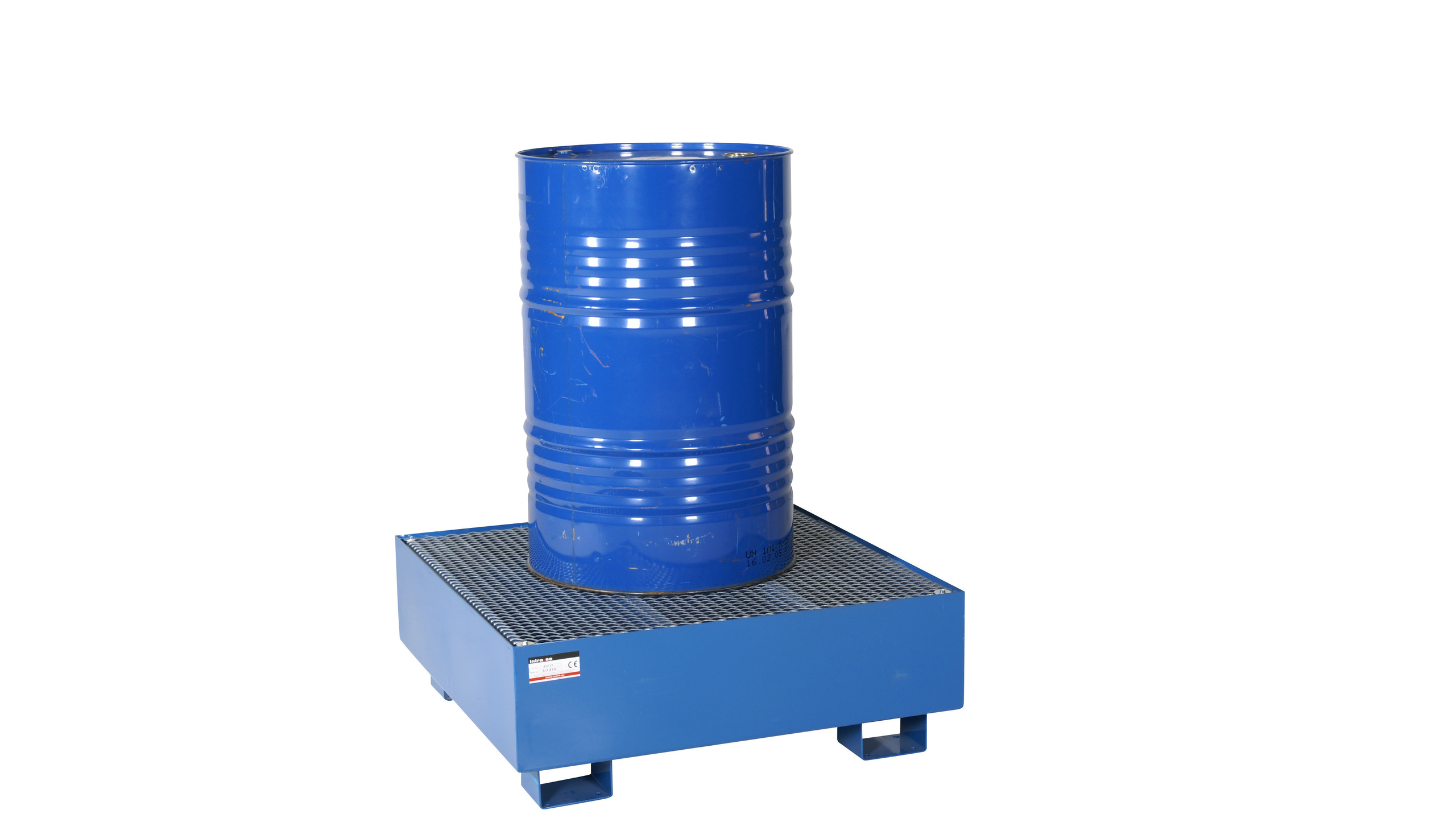 Fatpall med behållare för uppsamling av miljöfarliga ämnen vid eventuella läckage. Alla typer av stående fat kan lagras på pallen och den kan även transporteras med gaffelvagn och truck. Fatet står på galvaniserad sträckmetall, ramen består av fyrkantsrör, och uppsamlingskärlet är av plåt i pulverlackerad blå färg. Viktig att ha till hands vid nästan all hantering eller förvaring av fat.