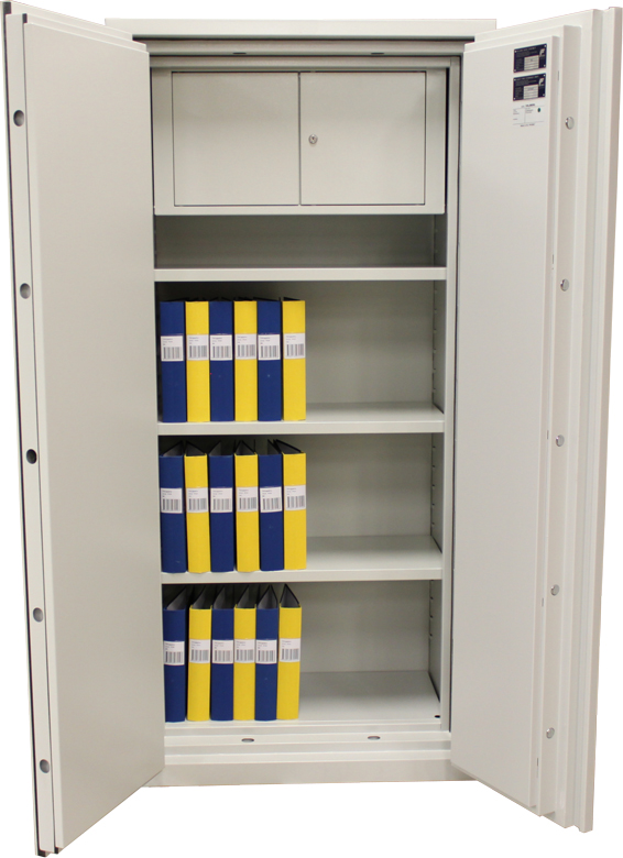 Brandklassat stöldskyddsskåp för förvaring av dokument och värdesaker. Passar utmärkt i hemmet men även i butik och kontor. Förutom att skåpet är prisvärt, är det även testat och certifierat för att stå emot inbrottsförsök samt brand i 60 minuter. Det har dubbla dörrar och fyra stycken hyllor. Detta betyder att det finns gott om plats att förvara större mängder pärmar, kontrakt, smycken mm. Det är förberett för fastbultning och levereras med elkodlås eller nyckellås. Finns i flera olika storlekar.