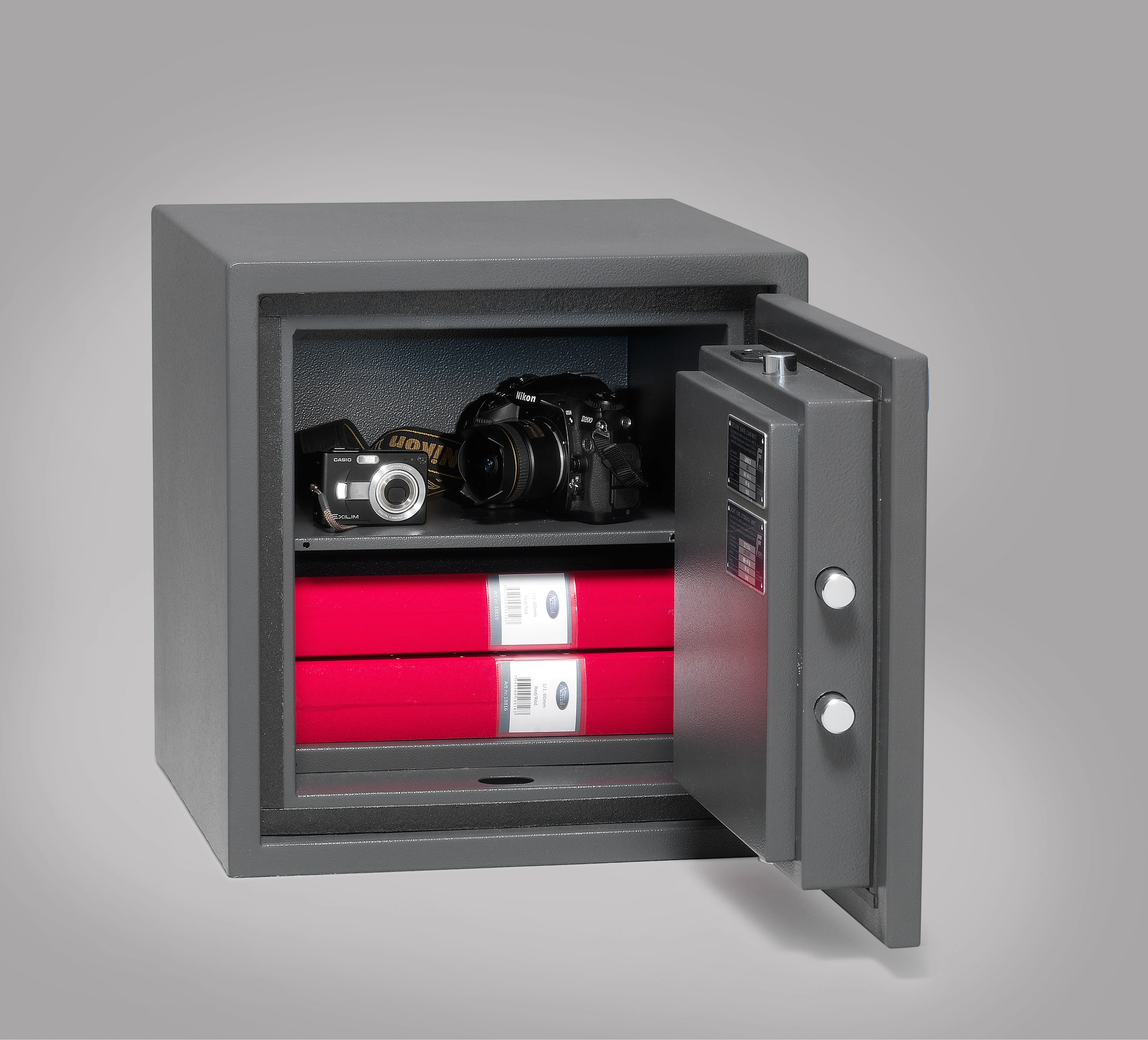 Brandklassat stöldskyddsskåp för förvaring av dokument och värdesaker som passar utmärkt i hemmet men även i butik och kontor. Skåpet ger ett dubbelt skydd i och med att det skyddar mot såväl stöld som brand. Skåpet är testat och certifierat för att stå emot inbrottsförsök samt stå emot brand i 60 minuter. Det är förberett för fastbultning och levereras med elkodlås.