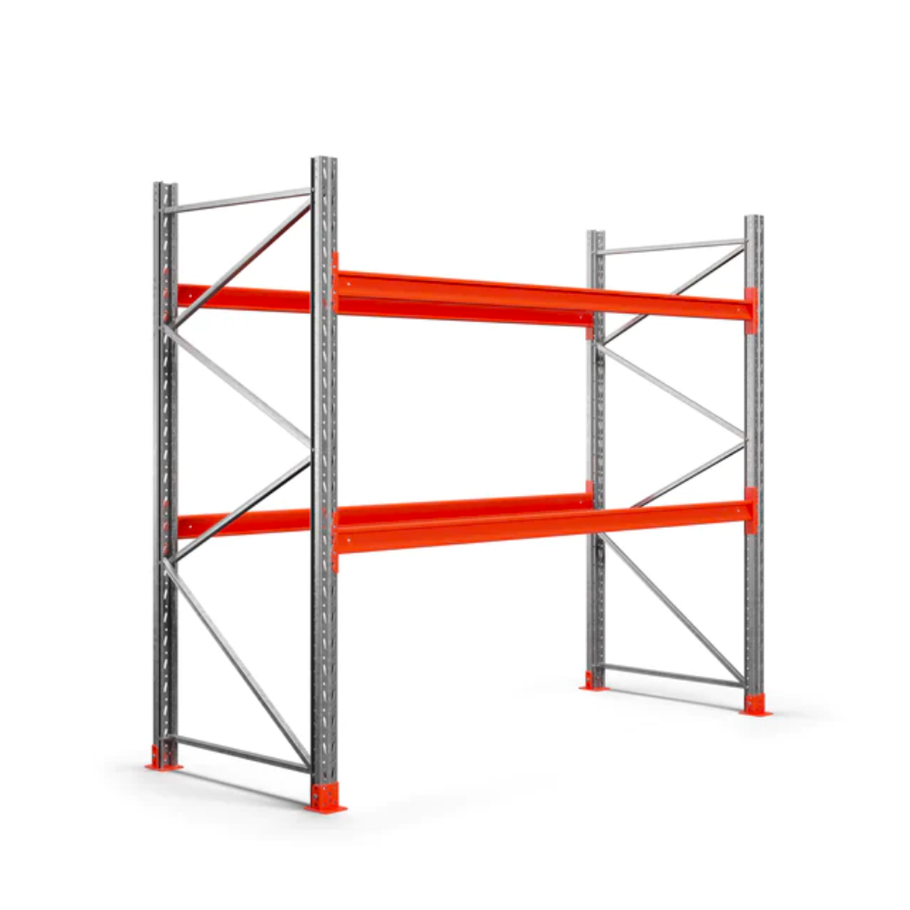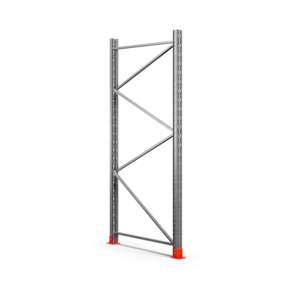 Gaveldel till ett pallställ från EAB. Gaveldelen är grunden i att skapa ett stabilt pallställ till ditt lager. Levereras komplett med stolpar, fotplattor, stag och skruvar. Om golvet är ojämnt kan du komplettera med nivelleringsplattor.