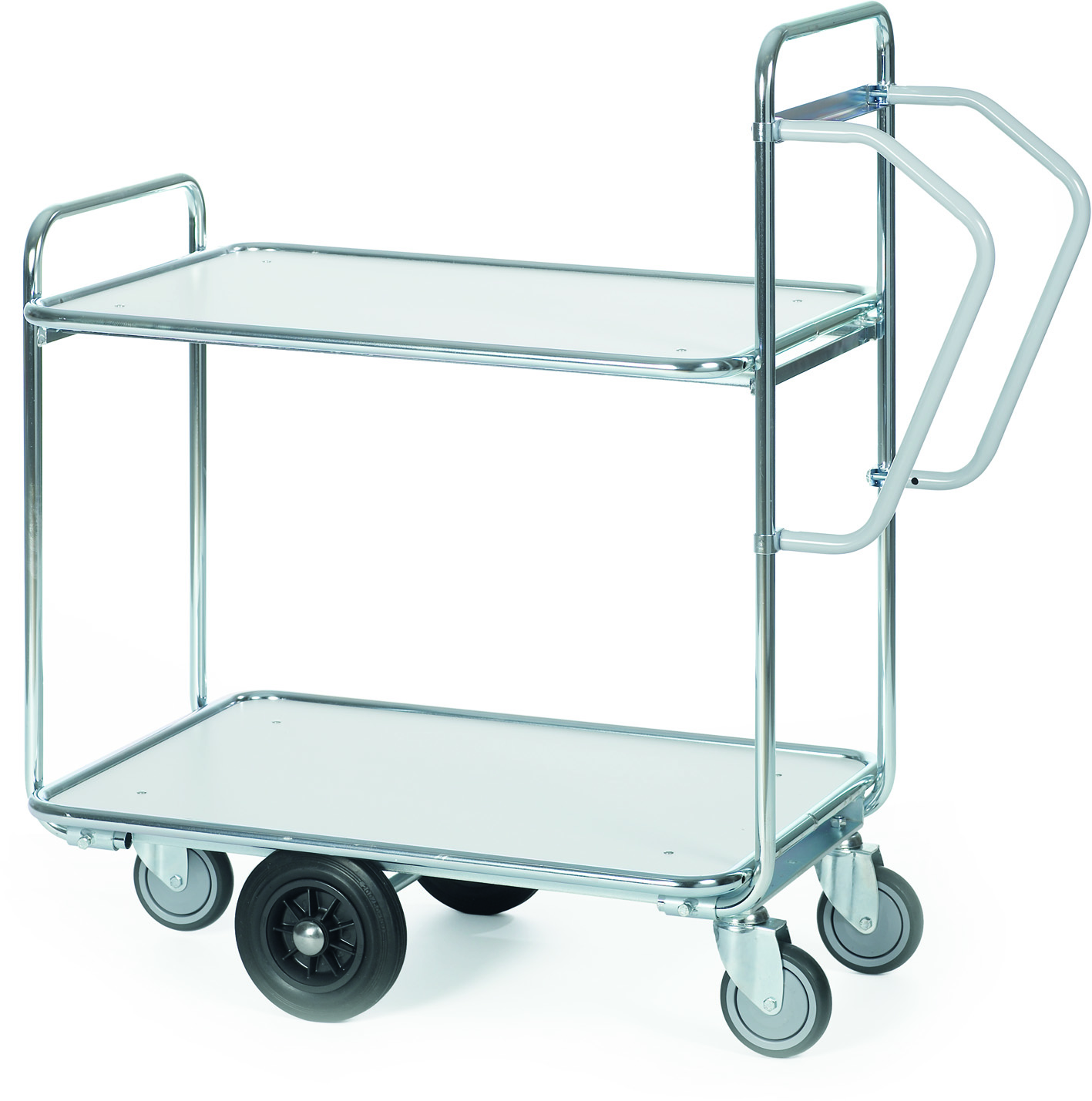 Rejäl och praktisk hyllvagn som ryms i smala gångar. Passar bra inom lager, industri, butik, skola eller andra miljöer där en pålitlig vagn förenklar arbetet. Hyllorna är flexibelt flyttbara och kan anpassas efter lastens storlek. Med bekväma körhandtag kan du smidigt förflytta vagnen - även vid tyngre last! Produkten finns tillgänglig i flera varianter. Stommen består av blankförzinkade stålrör med en diameter på 22 mm. Vagnen har fyra stycken länkhjul och är utrustad med ett balansmontage för ökad stabilitet och körbarhet. Maxbelastning är 300 kg (150 kg per hylla).
