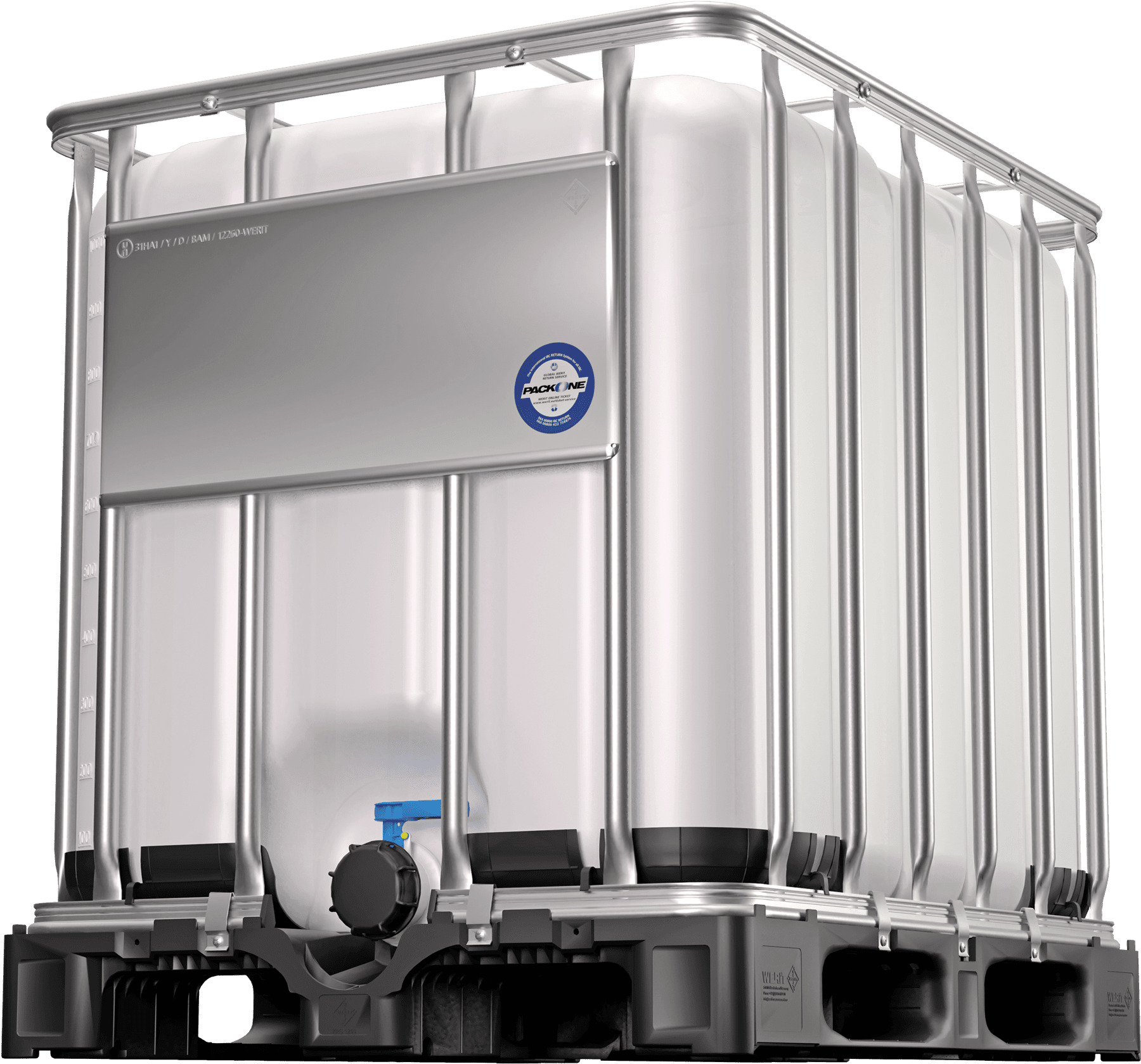En robust IBC-behållare på 600 liter för industriell vätskehantering och transport. Monterad på pall för extra stabilitet.