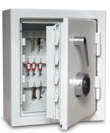 Ett inbrottssäkert säkerhetsskåp för trygg förvaring av nycklar. Skåpet är certifierat och godkänt för förvaring av 140 st nycklar eller nyckelknippor. Har ett omställningsbart högsäkerhetslås med 2 stycken korta nycklar. Ger förutom säkerhet också en strukturerad och praktisk förvaring. Rekommenderat belopp i olarmat skåp är 30 000 SEK. Detta skåp kan förankras i vägg eller pelare, alternativt stå direkt på golvet. Går att få med ett elektroniskt kodlås.