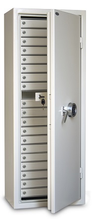 Ett inbrottssäkert skåp för trygg förvaring av nycklar. Certifierat och godkänt för förvaring av 140 nycklar eller nyckelknippor. Har ett omställningsbart högsäkerhetslås med 2 korta nycklar. Ger förutom säkerhet också en strukturerad och praktisk förvaring. Rekommenderat belopp i olarmat skåp är 30 000 SEK. Detta skåp kan förankras i vägg eller pelare, alternativt stå direkt på golvet. Finns i många olika storlekar.