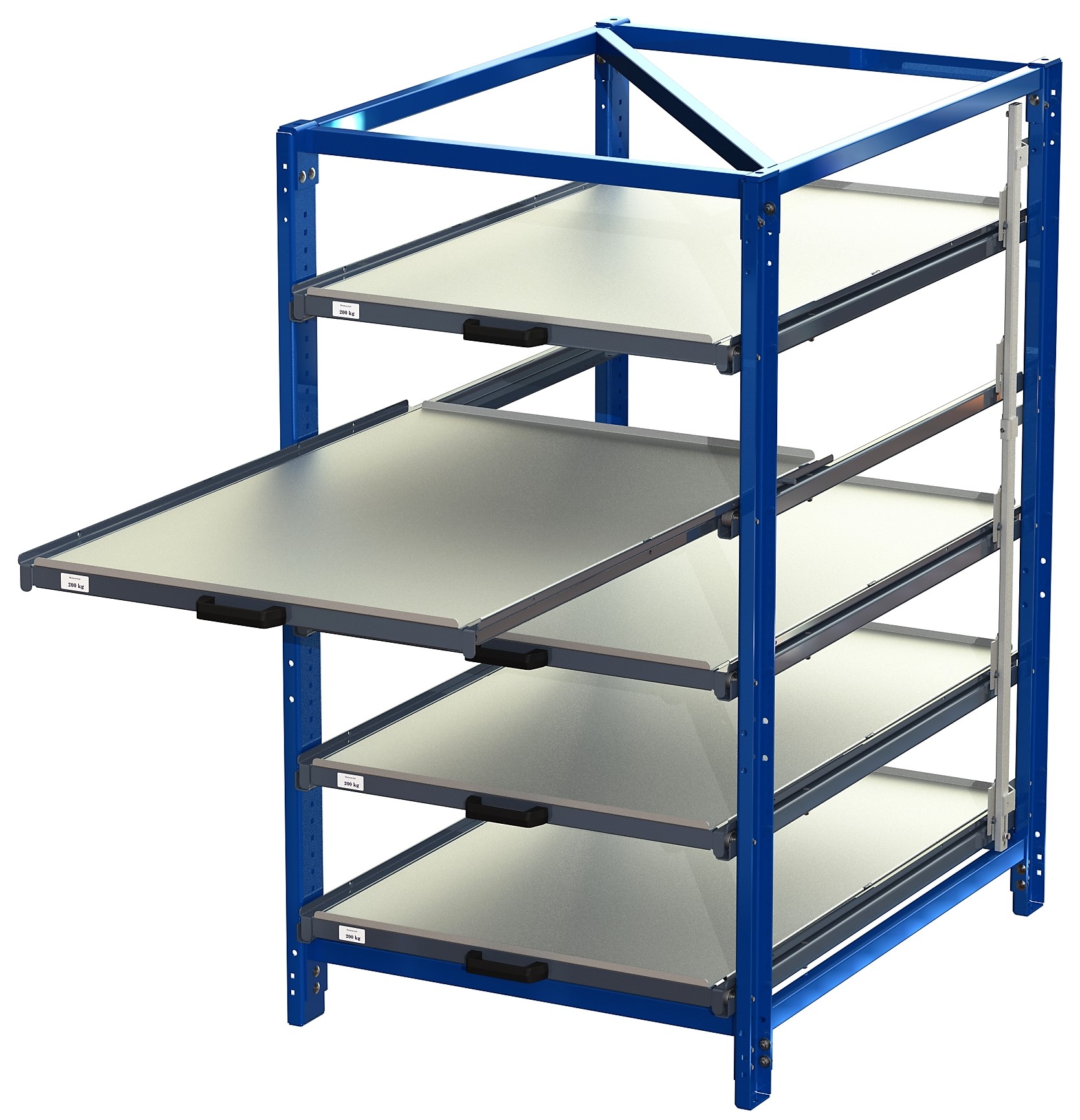 Industribyrå med 4 hyllor och utdrag på 70% . Klarar upp till 200 kg och hanteras från kortsidehantering – en slitstark förvaringslösning för industri och lager.
