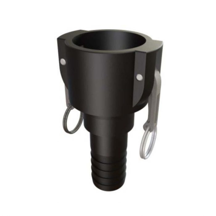 Kopplar samman en 2-tumsanslutning med en 1½-tumsslang via ett integrerat svivel, vilket möjliggör snabb och läckagefri koppling utan att slangen vrider sig. Passar för flödeshantering av vätskor och kemikalier i industri- och lagermiljöer där dimensionsanpassning mellan rörledning och slang krävs. Kamlockprincipen ger en säker låsning utan verktyg.
