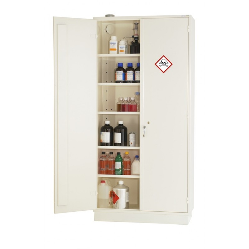 Ett idealiskt och säkert konstruerat kemikalieskåp som klarar kravet för klass 1. Brandtestad med avseende för utvändig brand enligt SP metod 2369. Sveriges Tekniska Forskningsinstitut har testat ventilationen och lackeringen är flamsäker. Skåpet är utrustat med ventilationskanaler och utsugningspunkter på 100 mm, som gör att ytorna mellan hyllplanen får luftbehandling. Om du önskar förvara större dunkar kan du förse skåpet med bottentråg. Effektiva flyttbara hyllor med slutna hörn och uppvikta kanter för att förebygga avrinning av spillande.