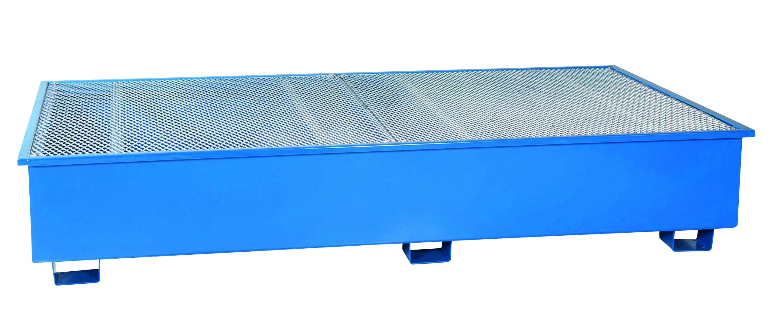 Miljöpall anpassad för två 1000 l IBC/Cipax-behållare, gjord av blålackerad stålplåt med galvaniserat durkgaller.