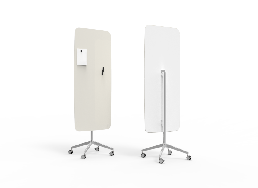 Mobil skrivtavla med en unik rundad flow-form som helt saknar raka linjer, vilket ger en mjuk känsla i rummet. Tillverkad i härdat optiskt glas som ger en exakt färgåtergivning och lyster. Fötter och ben i polerad aluminium och vitlackerad baksida.