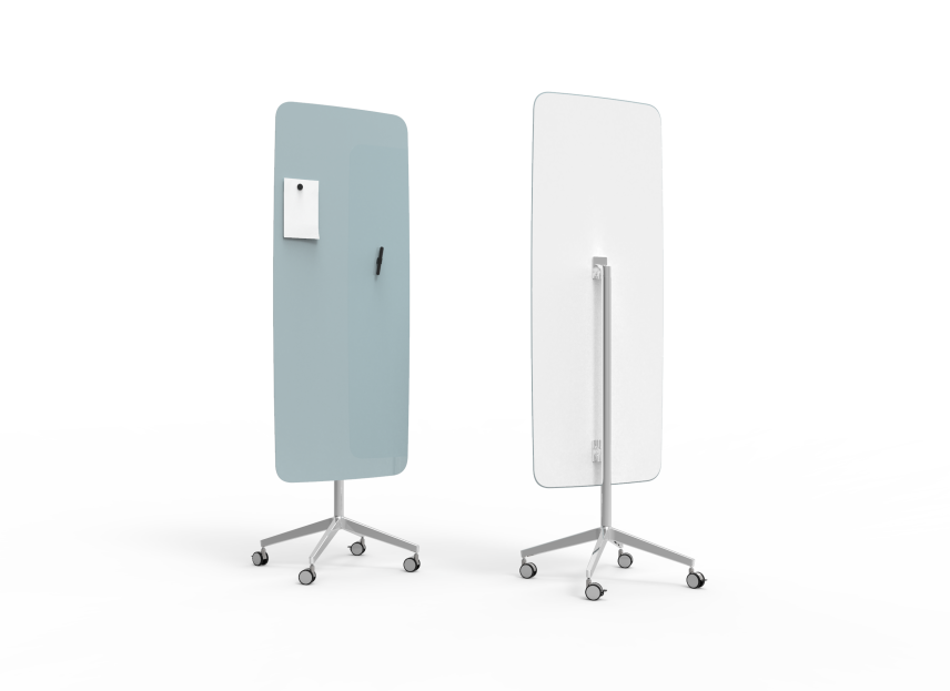 Mobil skrivtavla med en unik rundad flow-form som helt saknar raka linjer, vilket ger en mjuk känsla i rummet. Tillverkad i härdat optiskt glas som ger en exakt färgåtergivning och lyster. Fötter och ben i polerad aluminium och vitlackerad baksida.