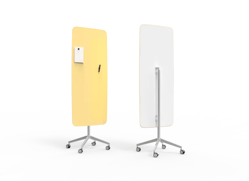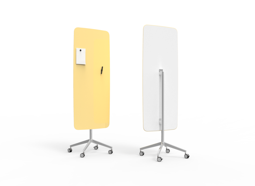 Mobil skrivtavla med en unik rundad flow-form som helt saknar raka linjer, vilket ger en mjuk känsla i rummet. Tillverkad i härdat optiskt glas som ger en exakt färgåtergivning och lyster. Fötter och ben i polerad aluminium och vitlackerad baksida.