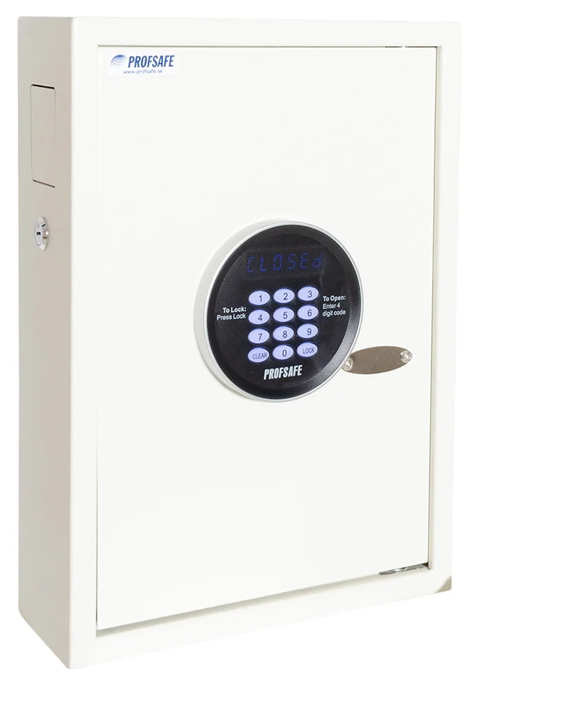 Robust inbrottsfördröjande nyckelskåp med 50 krokar. Skåpet är utrustat med en praktisk låsbar inkastlucka för nyckeldeponering och elkodlås med nödöppningsnyckel som standard. Standardkulör är ljusgrå och skåpet har förborrade hål för att enkelt kunna monteras på vägg. Som tillbehör kan du köpa till ett praktiskt avlastningsbord.