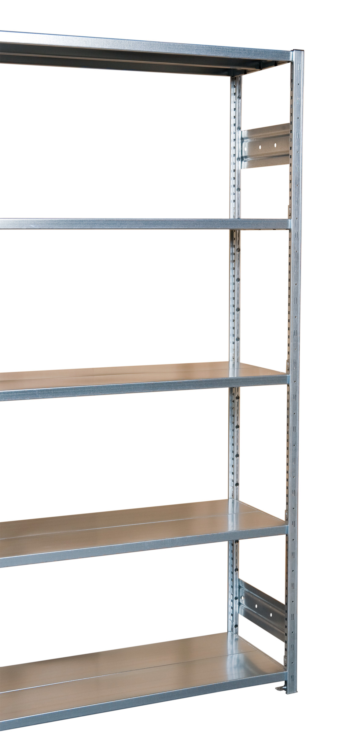 Ett hyllställ i hög kvalité med galvade detaljer, som tack vare sin stabila och rejäla konstruktion fungerar utmärkt i de flesta lagersammanhang. Är med sin flexibilitet ett utmärkt alternativ för de flesta typer av lagerhållning då hyllorna både kan byggas på med flera sektioner och anpassas efter önskat hylldjup. Var fjärde sektion stadgas upp med ett ryggkryss och hyllorna levereras med expanderbultar för att på ett säkert sätt kunna sättas fast i golvet. Varje hylla har en maxbelastning på 150 kg. Denna påbyggnadssektion har en höjd på 2500 mm, finns med fem olika djup och har i standardutförandet fem hyllplan. Dessa hakas fast i kraftiga bärbalkar, vilket både ger en säker förvaring med pålitliga hyllplan och fungerar stabiliserande för gavlarna.