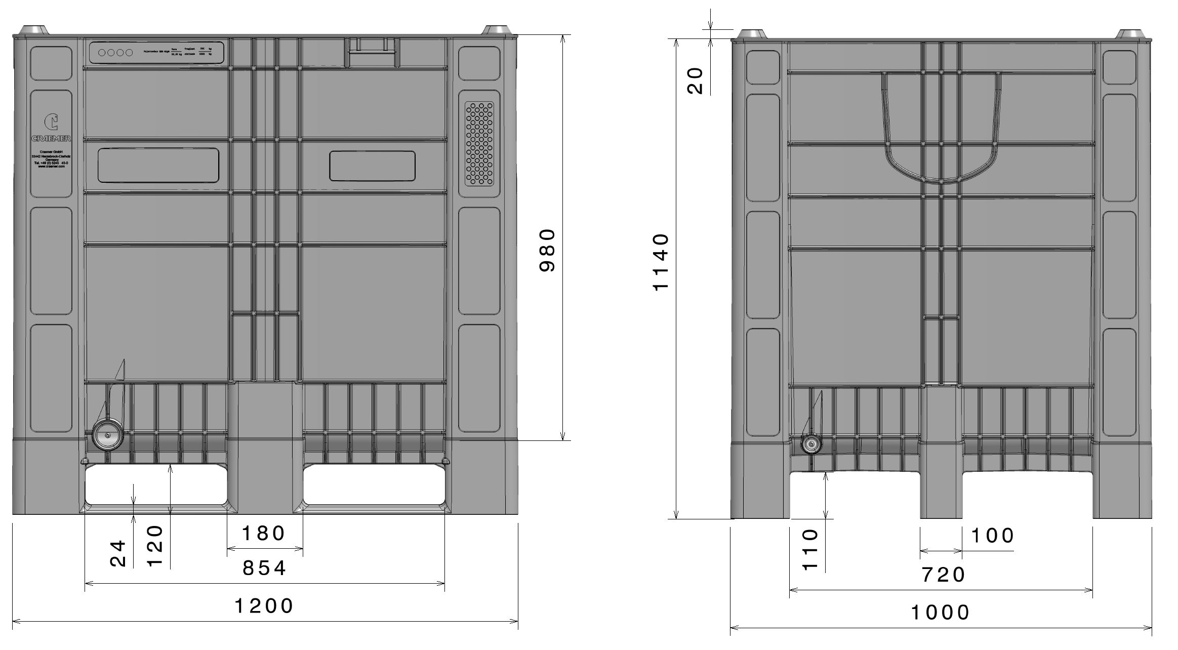 Specifikation Längd (mm) 1200 Bredd (mm) 1000 Höjd (mm) 1140 Innermått Längd (mm) 1110 Innermått Bredd (mm) 915 Innermått Höjd (mm) 970 Kubikmeter / Volym (m³) 1 Volym (L) 1000 Egenvikt (kg) 49.5 Maxbelastning (kg) 1000 Maxbelastning dynamisk (kg) 1500 Maxbelastning vid stapling (kg) 4000 Färg Grå Staplingsbar Ja Material HDPE (High Density Polyetylene) Materialursprung Nymaterial Produktens ursprung EU Återvinningsbar Ja Kan beställas med logga/tryck Ja, begär offert Underrede Medar Dräneringshål Tillval Högsta användningstemperatur (°C) 40 Lägsta användningstemperatur (°C) -30 Tvättas i max (°C) 90 Livsmedelsgodkänd Ja UN-Godkänd Nej - Dokument