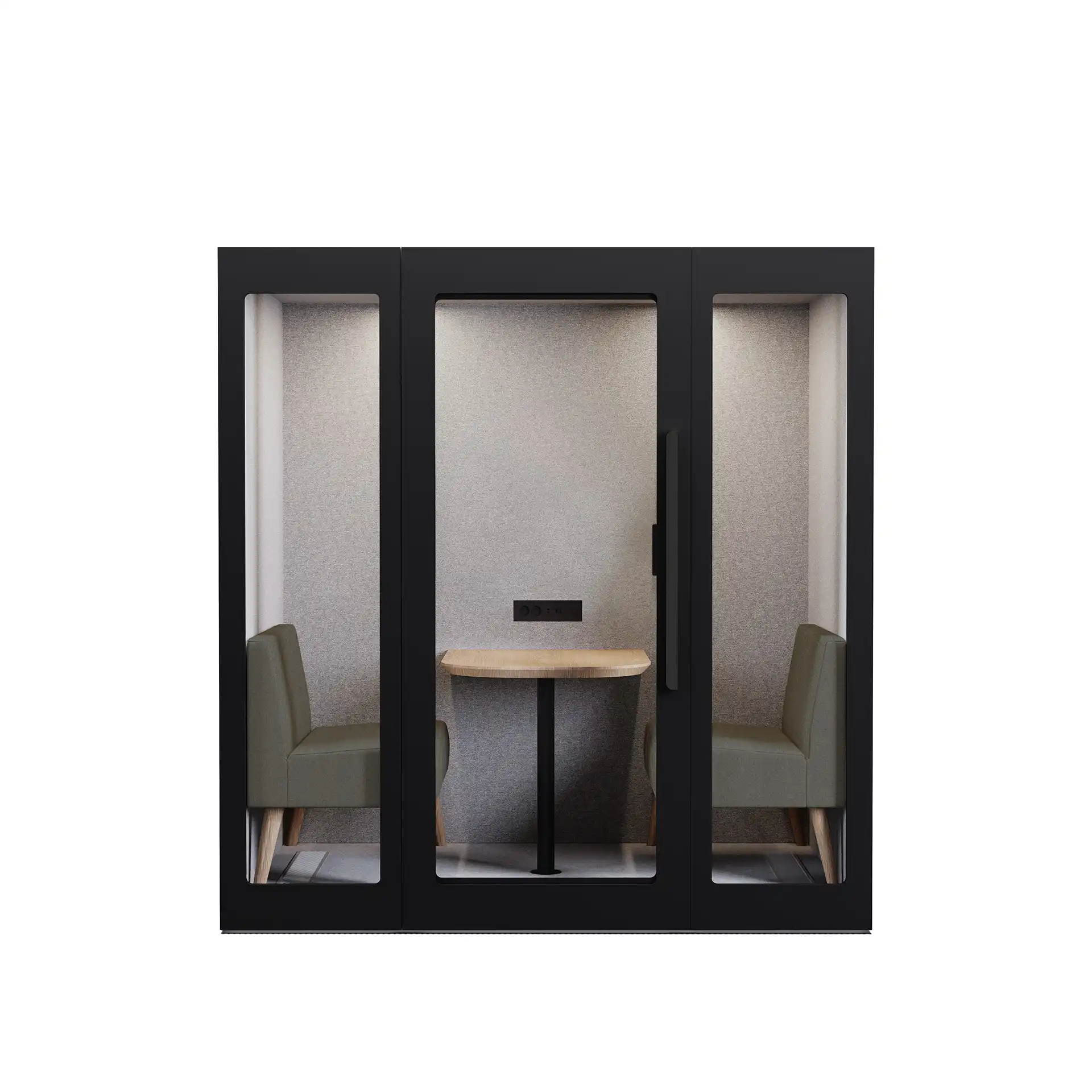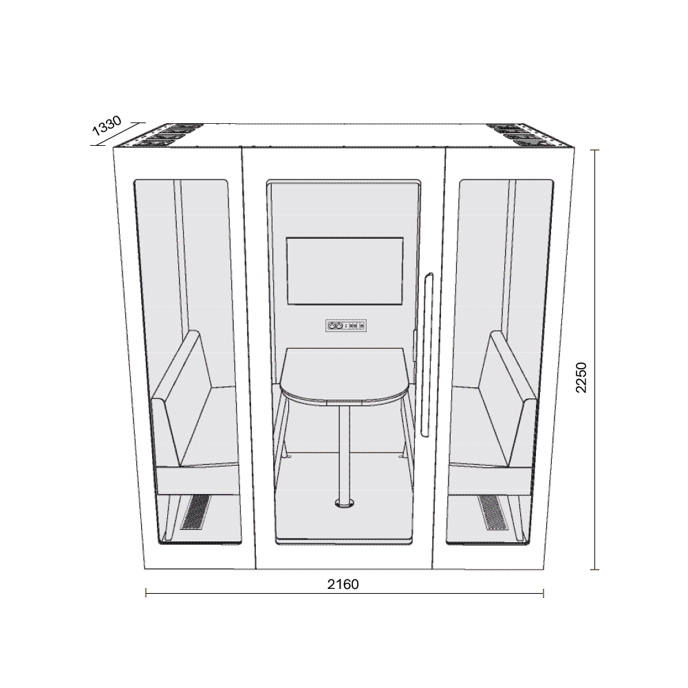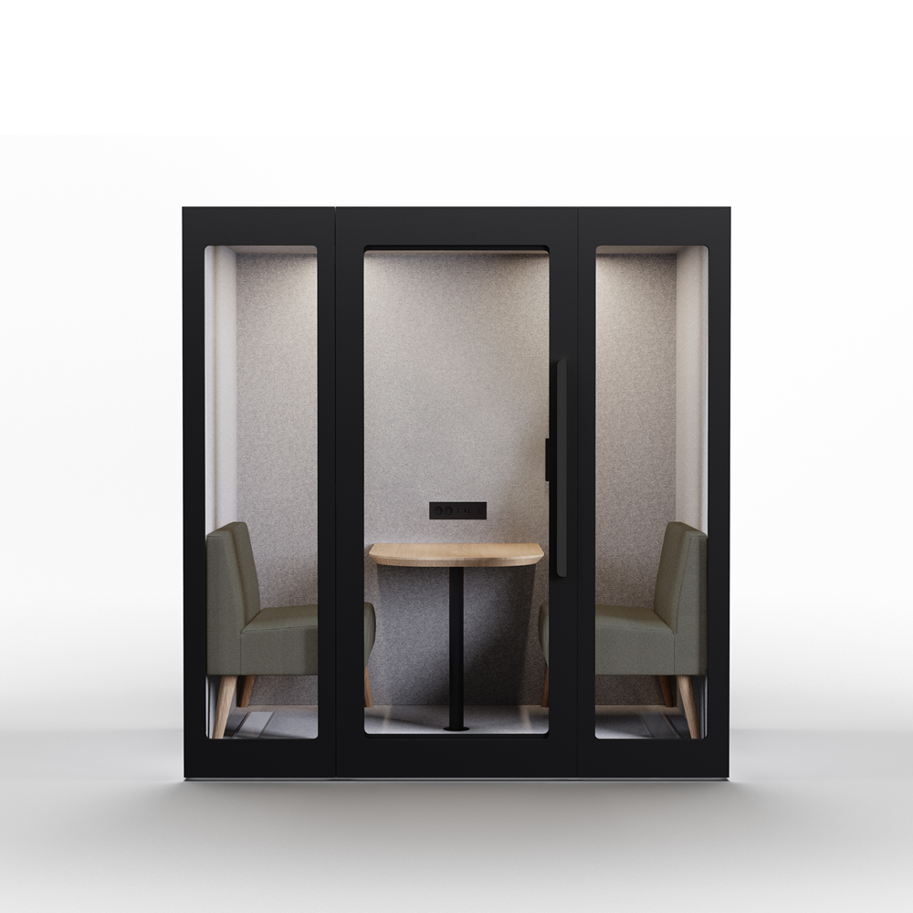 Lugnet Pod Kvartett - Exteriör svart/Möbeltyg Cura 61259 Lugnet Pod Kvartett är den största modellen i serien och passar för möten med upp till fyra personer. • Ljudabsorberande prestanda • Dimbar LED-belysning • Tystgående ventilationsfläkt • Enkel att montera • Möbler ingår • Ventilation: 8 st justerbara ultratysta fläktar, max luftflöde på 690m2/h, fräsch luft in i båset var 31:e sekund. • Anslutningsmöjligheter interiör: 2x eluttag, 1x USB-A & 1x USB-C uttag. Valfritt LAN. • Ljus: Dimbar, rörelseaktiverad 3000K LED-lampor. • Flyttbar - på hjul. • Frakt, montering och installation: Offereras separat.