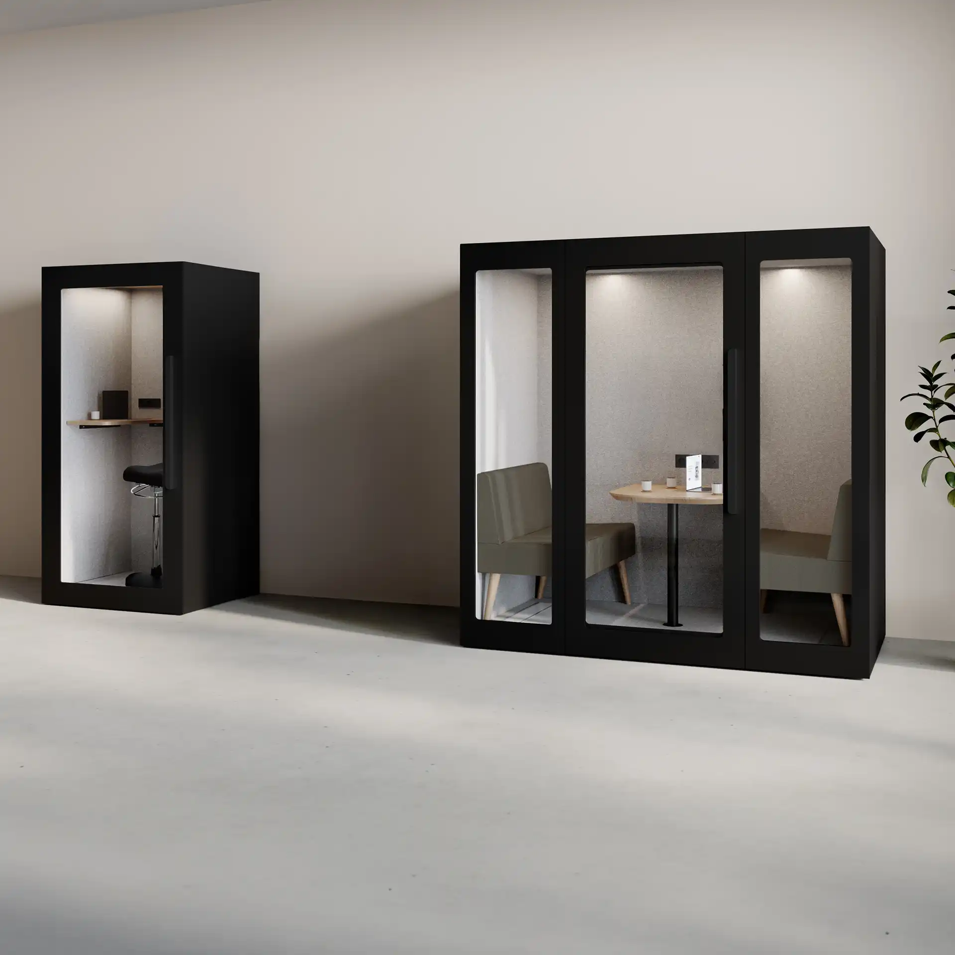 Pod Lugnet Kvartett, Exteriör svart/Soffor tyg Cura varmgrå kombinerar funktion och design för att passa i moderna arbetsmiljöer.