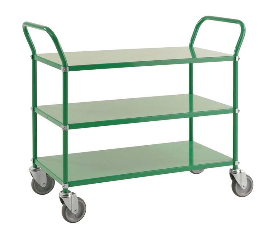 Tre stadiga hyllplan som håller lasten på plats vid transport. Handtagen är utformade för att du ska få bästa möjliga grepp och har en vinkel som gör vagnen lätt att förflytta. Finns i flera färgglada färger. Med våra rullvagnar rullar lasten säkert! Hyllplanen har en dimension på 900x400 mm och vagnen har fyra länkhjul med en diameter på 125 mm. Hyllplanen kan monteras med kanten upp eller ned efter eget önskemål. Klarar upp till 250 kg.- Rullvagn i olika färger