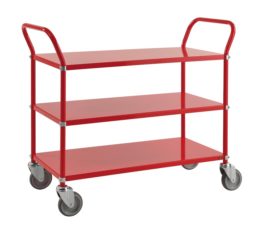 Tre stadiga hyllplan som håller lasten på plats vid transport. Handtagen är utformade för att du ska få bästa möjliga grepp och har en vinkel som gör vagnen lätt att förflytta. Finns i flera färgglada färger. Med våra rullvagnar rullar lasten säkert! Hyllplanen har en dimension på 900x400 mm och vagnen har fyra länkhjul med en diameter på 125 mm. Hyllplanen kan monteras med kanten upp eller ned efter eget önskemål. Klarar upp till 250 kg.- Rullvagn i olika färger
