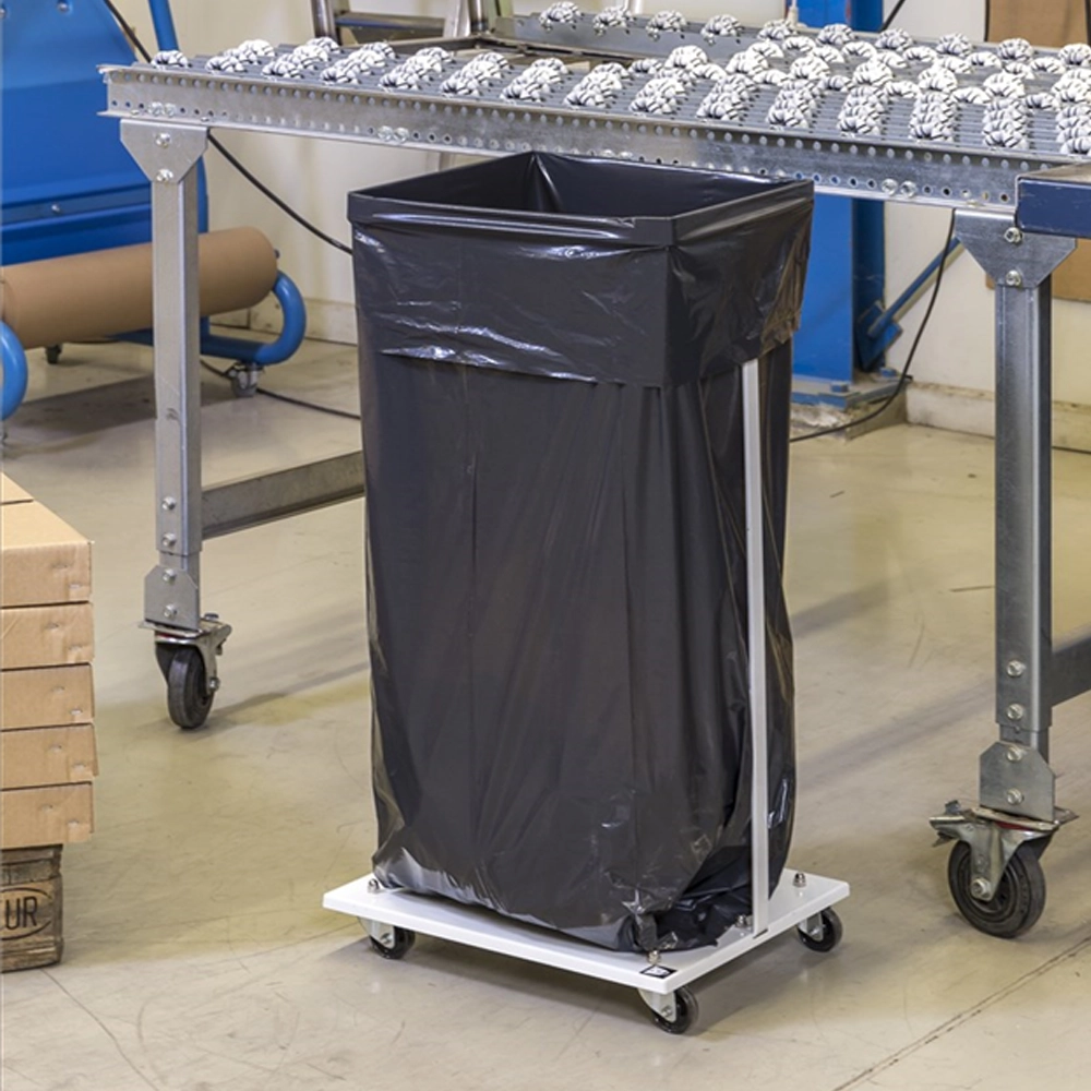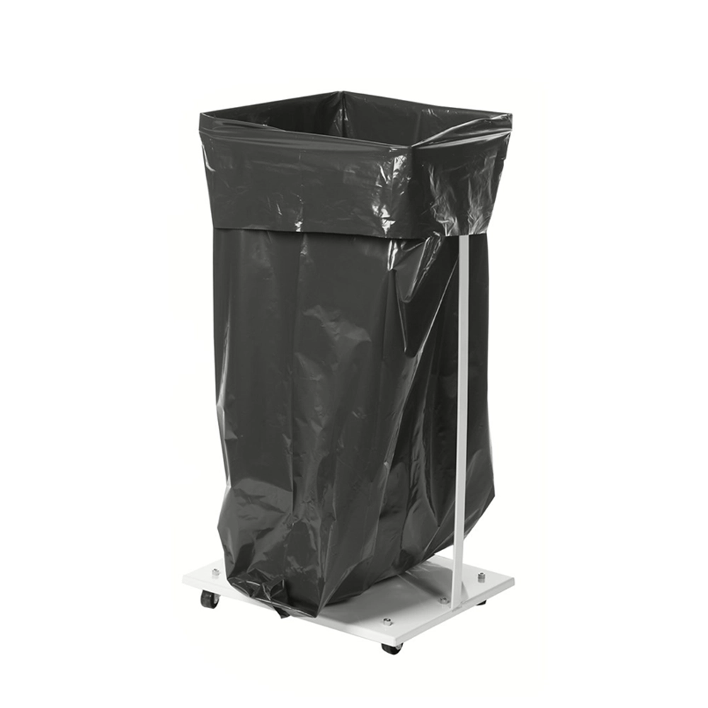 En snygg och praktisk säckställning av vitlackerad plåt som enkelt och smidigt förvarar och förflyttar sopsäckar. Har en hel bottenplatta som stöttar upp säcken och fyra länkhjul som gör vagnen lätt att transportera. Är gjord för 60L säck och har en maxbelastning på 30 kg.