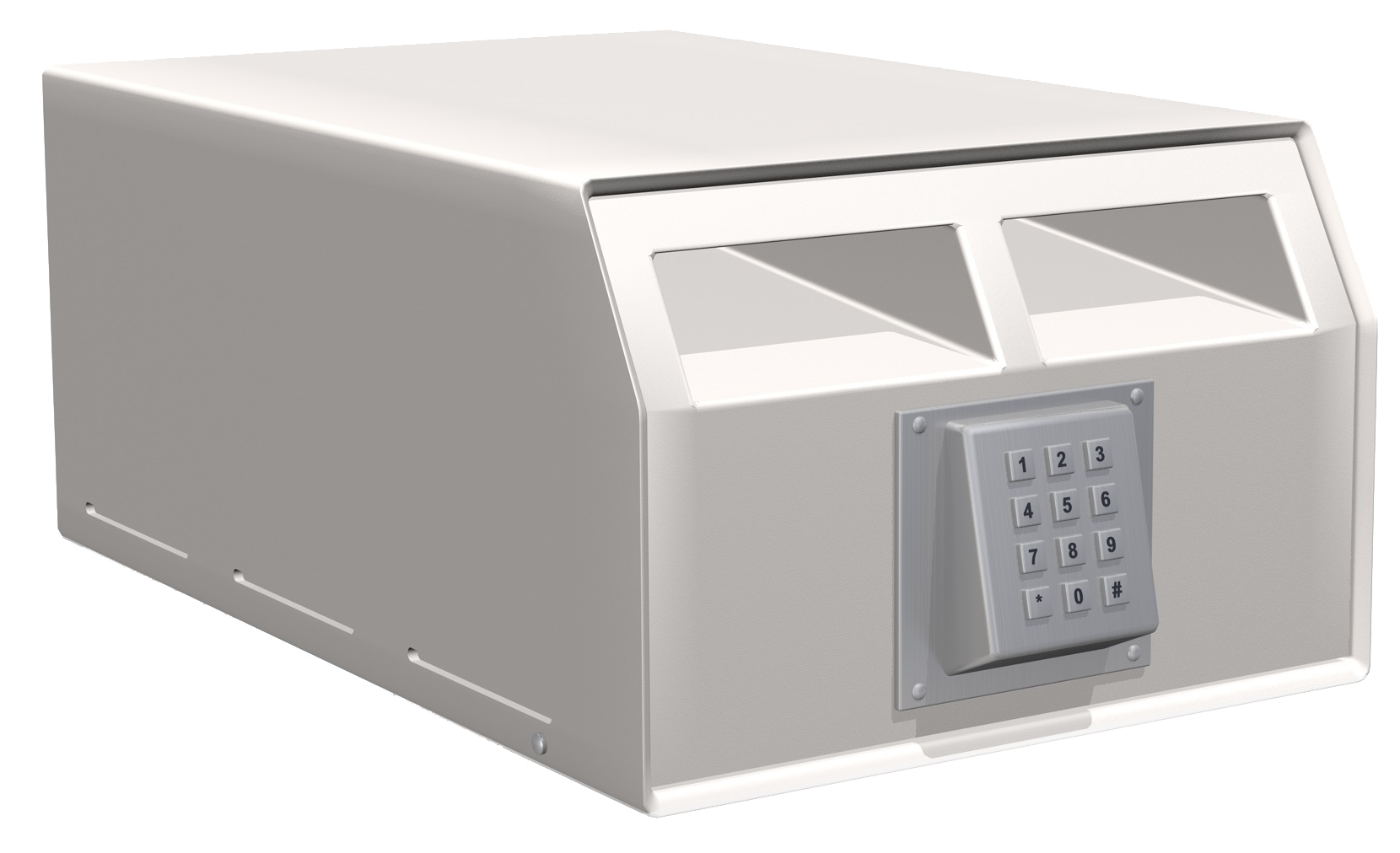Dubbelboxen (deponeringsbox) har elkodlås som standard. Denna rånskyddsbox kräver mindre plats på höjden än våra standard rånskyddsboxar. Boxen finns även med cylinderlå