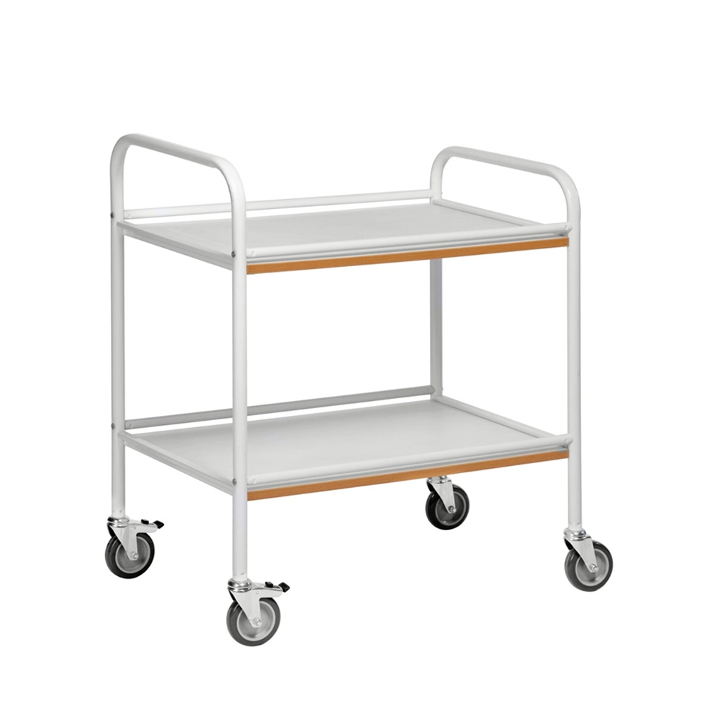 Smidig serveringsvagn i stål med stilren design. Perfekt för att transportera till exempel tallrikar och glas mellan köket och matplatsen. Sarger runtom för att förhindra att något glider av vagnen. Två hyllplan av laminat som är lätt att torka för god hygien. Två av de fyra länkhjulen har broms.