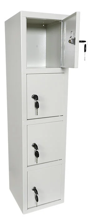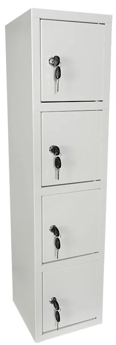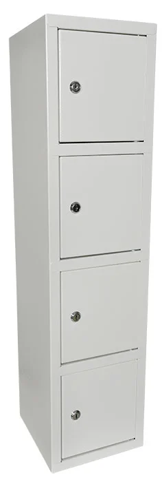 Småfacksskåp med 4 fack, cylinderlås med 2 nycklar. Förberedd med håltagning i ryggen för enkel montering.