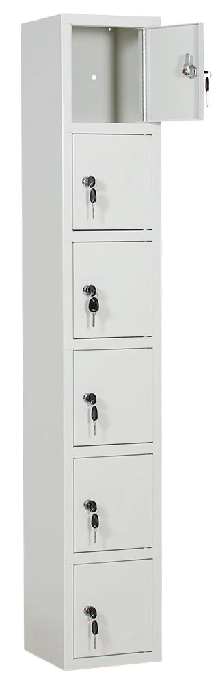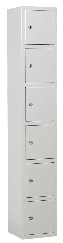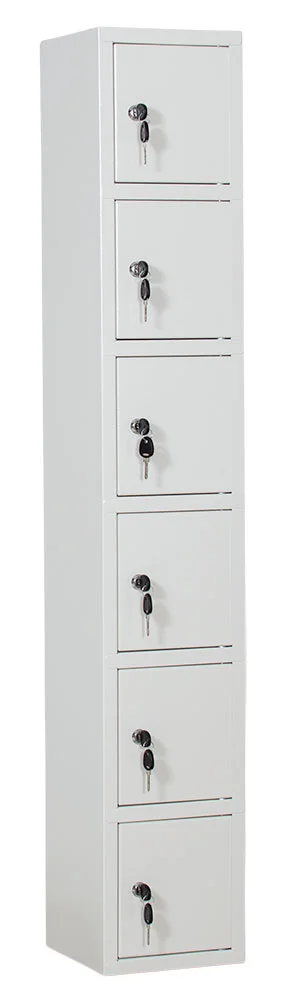Småfacksskåp med 6 fack, cylinderlås med 2 nycklar. Förberedd med håltagning i ryggen för enkel montering.