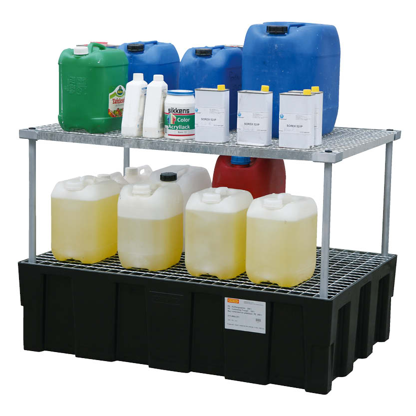 Förvaring av dunkar och kemikalieförpackningar ställer krav på att eventuellt spill fångas upp innan det når golvet. Karet är tillverkat i polyeten med hög beständighet mot oljor, syror och lut, och rymmer upp till 224 liter spillvätska. Det förzinkade gallret och det medföljande stålhyllplanet håller förpackningarna stabilt på plats, och konstruktionen klarar en last på 250 kg inom yttermåtten 1 205 × 805 mm och en höjd på 810 mm.
