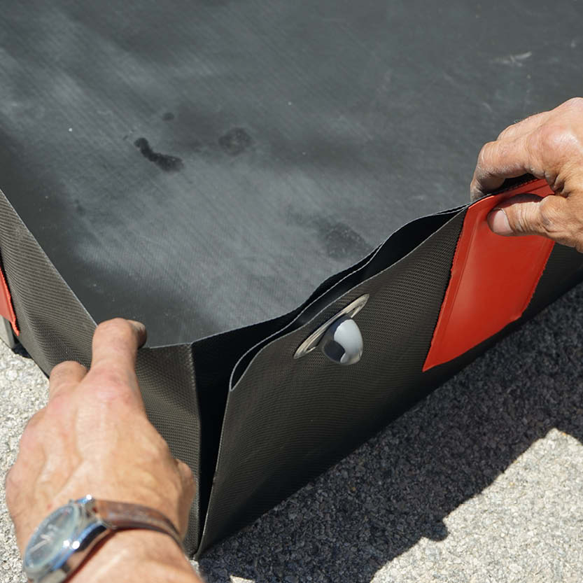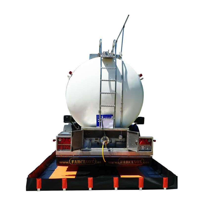 Hopfällbar spillpool i svetsad PVC som samlar upp läckage och spill under tunga fordon vid service, tankning eller uppställning. Tack vare aluminiumskenor längs kanterna behåller bassängen sin form även under belastning, och konstruktionen medger enkel hopfällning och förflyttning när invallning inte längre krävs. Med yttermåtten 7 000 × 2 500 mm och en höjd på 250 mm rymmer den upp till 4 375 liter — tillräckligt för lastbilar och andra tunga fordon.