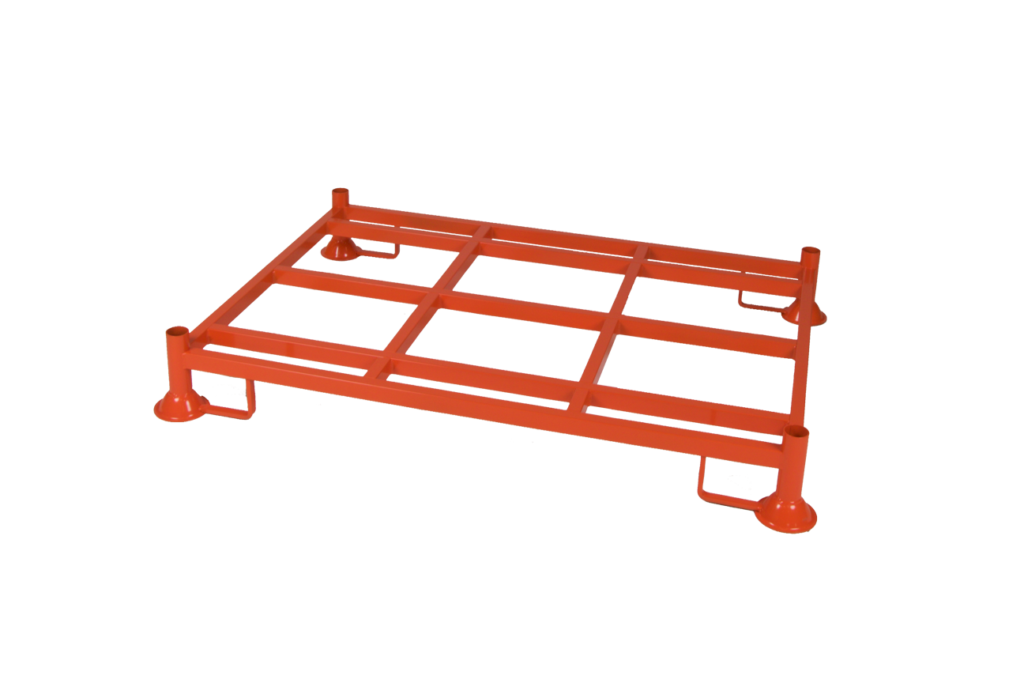 Stålpall lämpad för träpallshantering. Kompatibel med EUR-pallar. Pallarna är stapelbara och klarar då en belastning på upp till 1000 kg. Stödrören som används vid stapling finns i olika längder. Pallarna är pulverlackerade.
