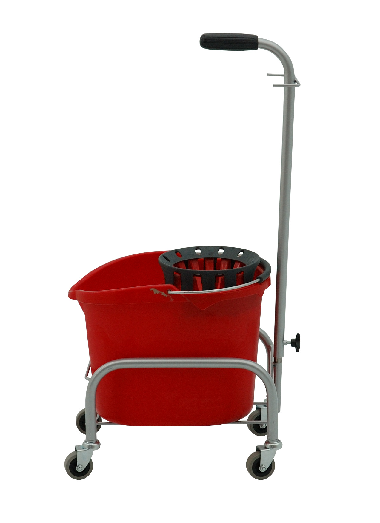 Smidig liten svabbvagn för skurhinkar. Utrustad med justerbart handtag för bättre ergonomi och 50 mm hjul som gör den lätt att rulla även i trånga utrymmen.