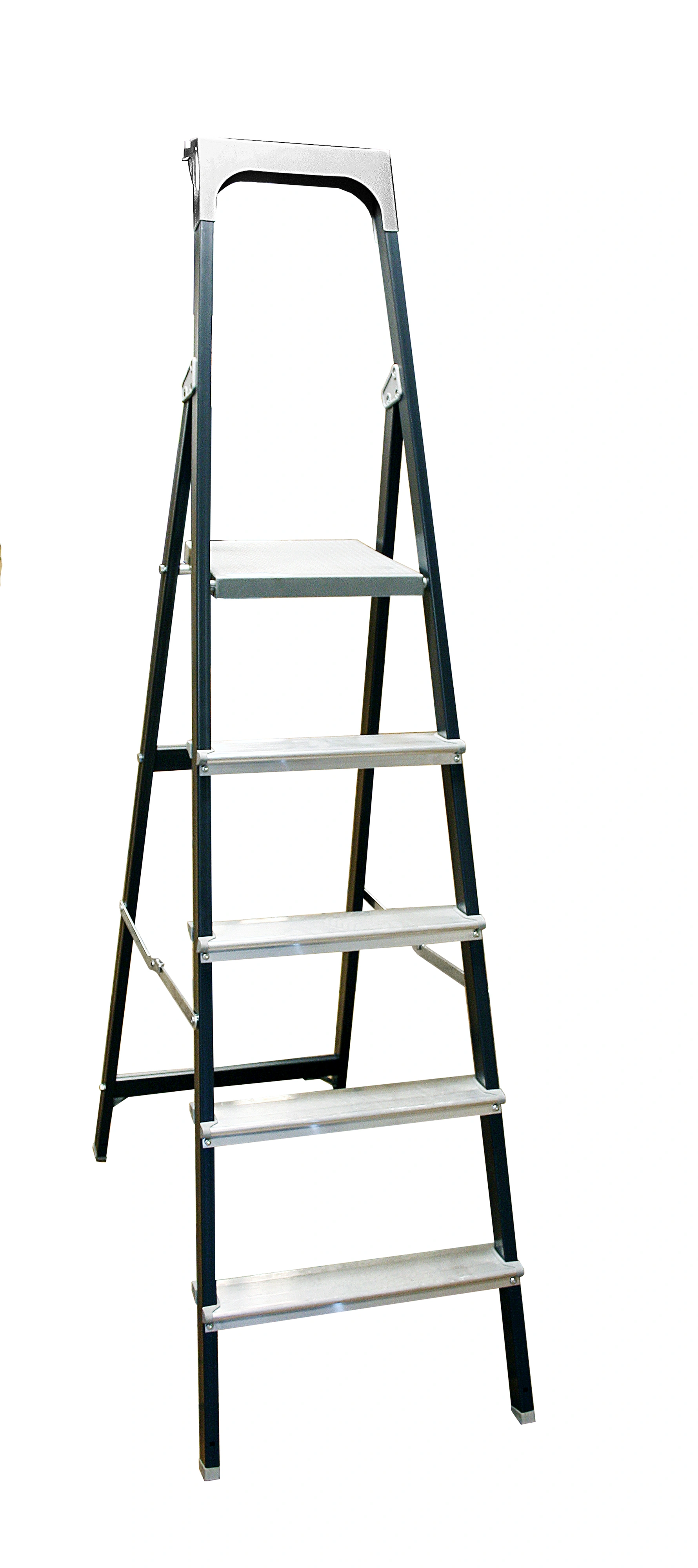 Svensktillverkad trappstege i aluminium med 7 steg. Trappstegens aluminiumprofiler är lackerade vilket ger trappstegen en tålig yta som inte svärtar av sig. Stålsaxarna är förzinkade och stegen har breda steg samt en stor plattform som gör den säker och stabil. Högst upp har du en praktisk verktygshylla där du kan förvara dina verktyg medan du står på stegen och arbetar.