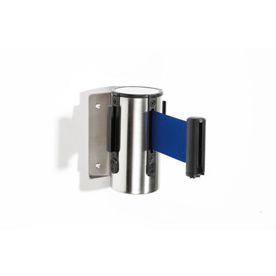 Denna praktiska väggkassett har indragbart band som höjer funktionaliteten som personbarriär. Kassetten har väggfäste i rostfritt stål och blått band.