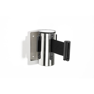 Denna praktiska väggkassett har indragbart band som höjer funktionaliteten som personbarriär. Kassetten har väggfäste i rostfritt stål och svart band.