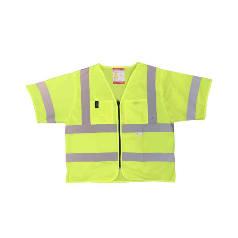 För arbete i miljöer med krav på hög synbarhet uppfyller västen kraven för klass 3 enligt EN ISO 20471, vilket är den högsta klassen för varselkläder. Utformad med kort ärm och dragkedja i framsidan, samt en bröstficka anpassad för exempelvis mobiltelefon. Materialet i 100 % polyester, 130 g/m², klarar tvätt upp till 25 gånger i 40°C och bibehåller därigenom de reflekterande egenskaperna över tid. Finns i one size och passar verksamheter inom lager, produktion och anläggning.