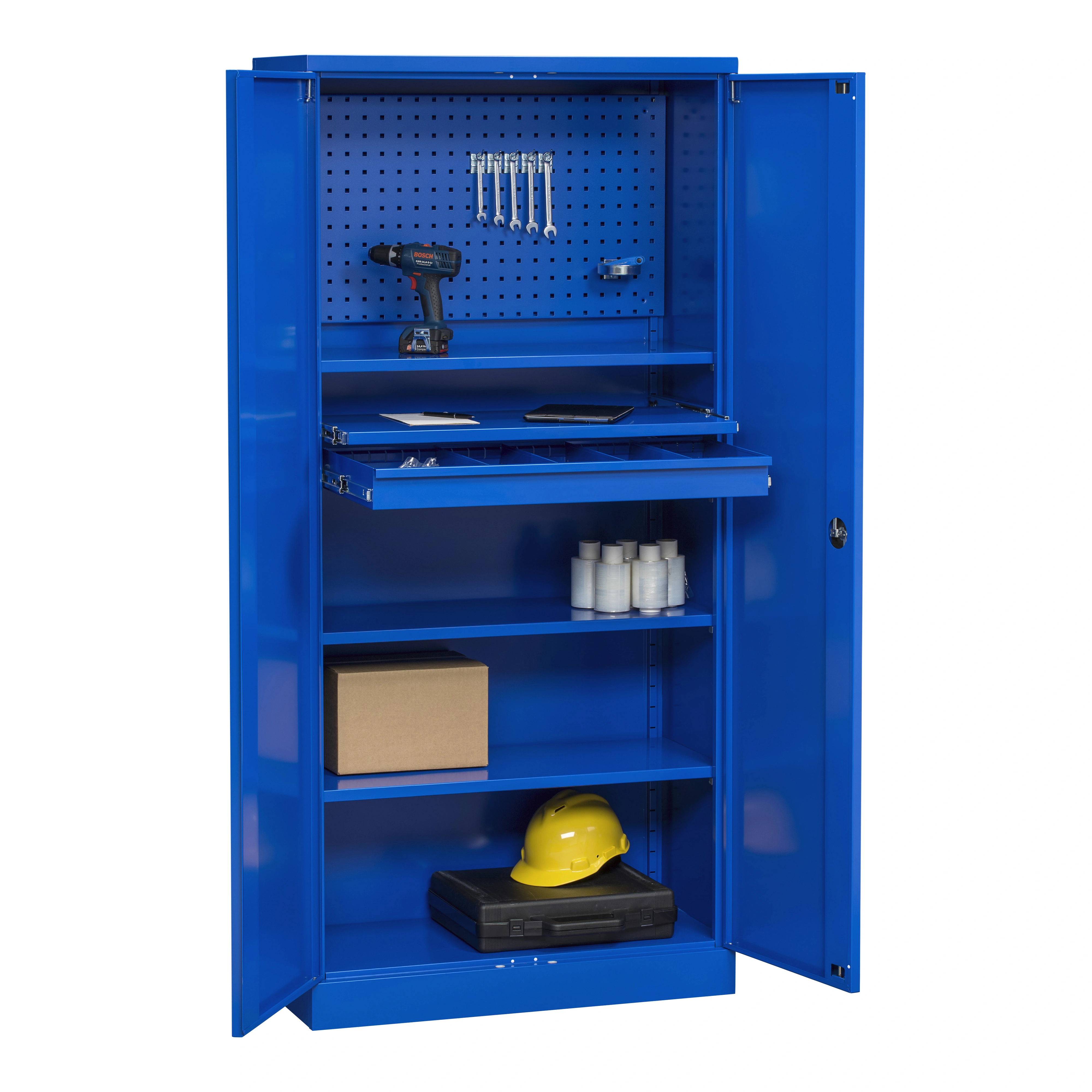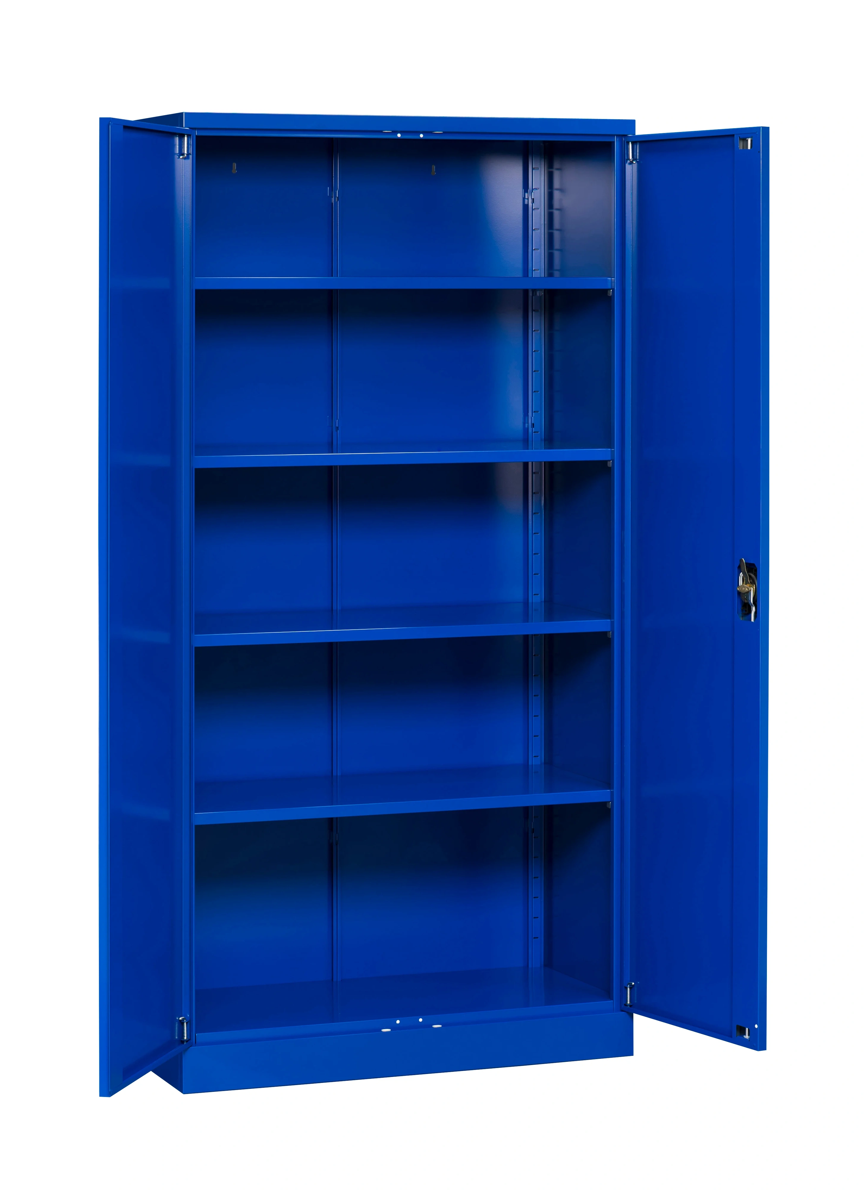 Skåpet passar utmärkt för kontor, arkiv eller lager. Dörrarna som låses på tre punkter är försedda med espanjolettlåsning. Skåpet har fyra stycken hyllor som är justerbara i höjdled. Skåpet är pulverlackerat och i blått.