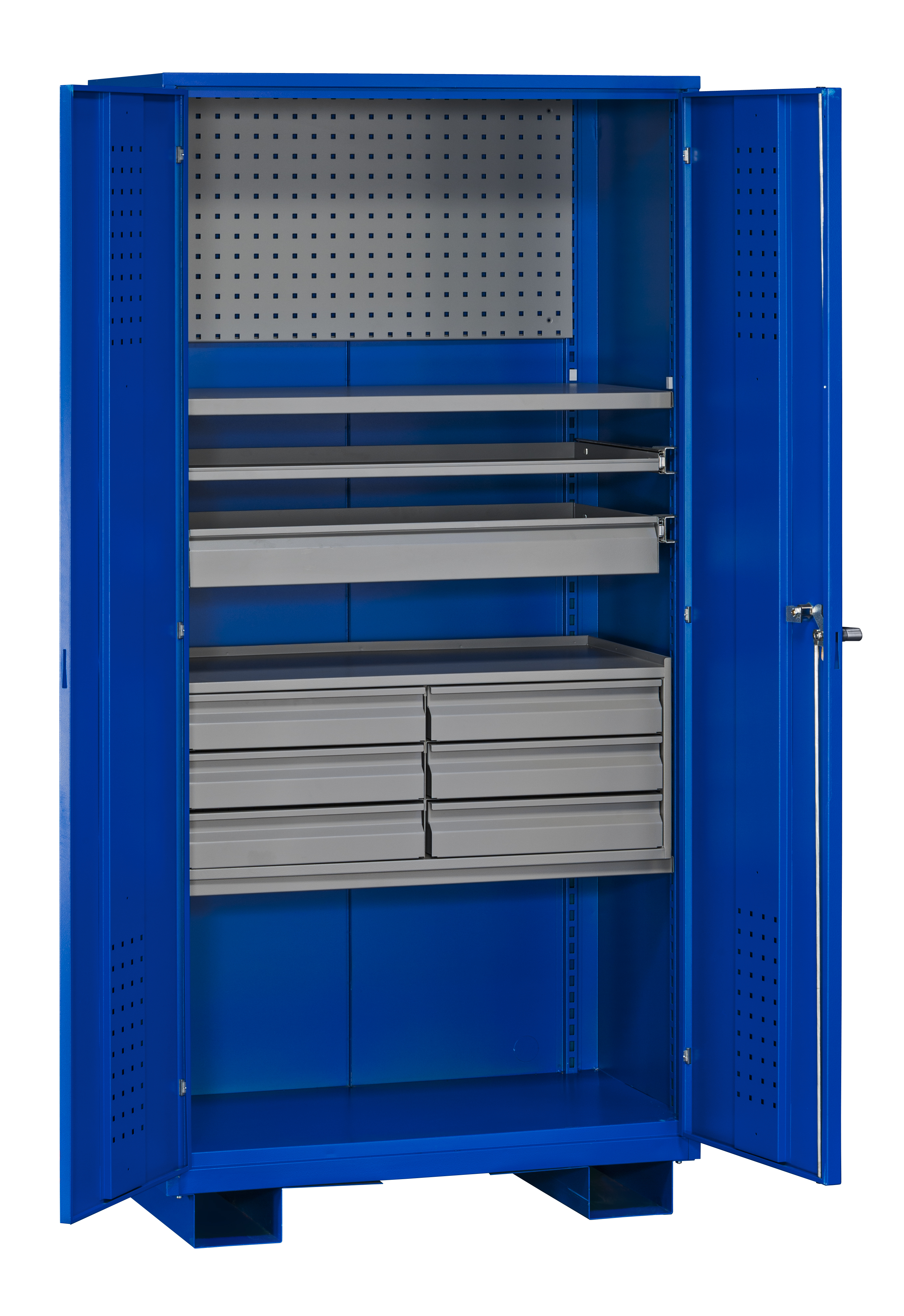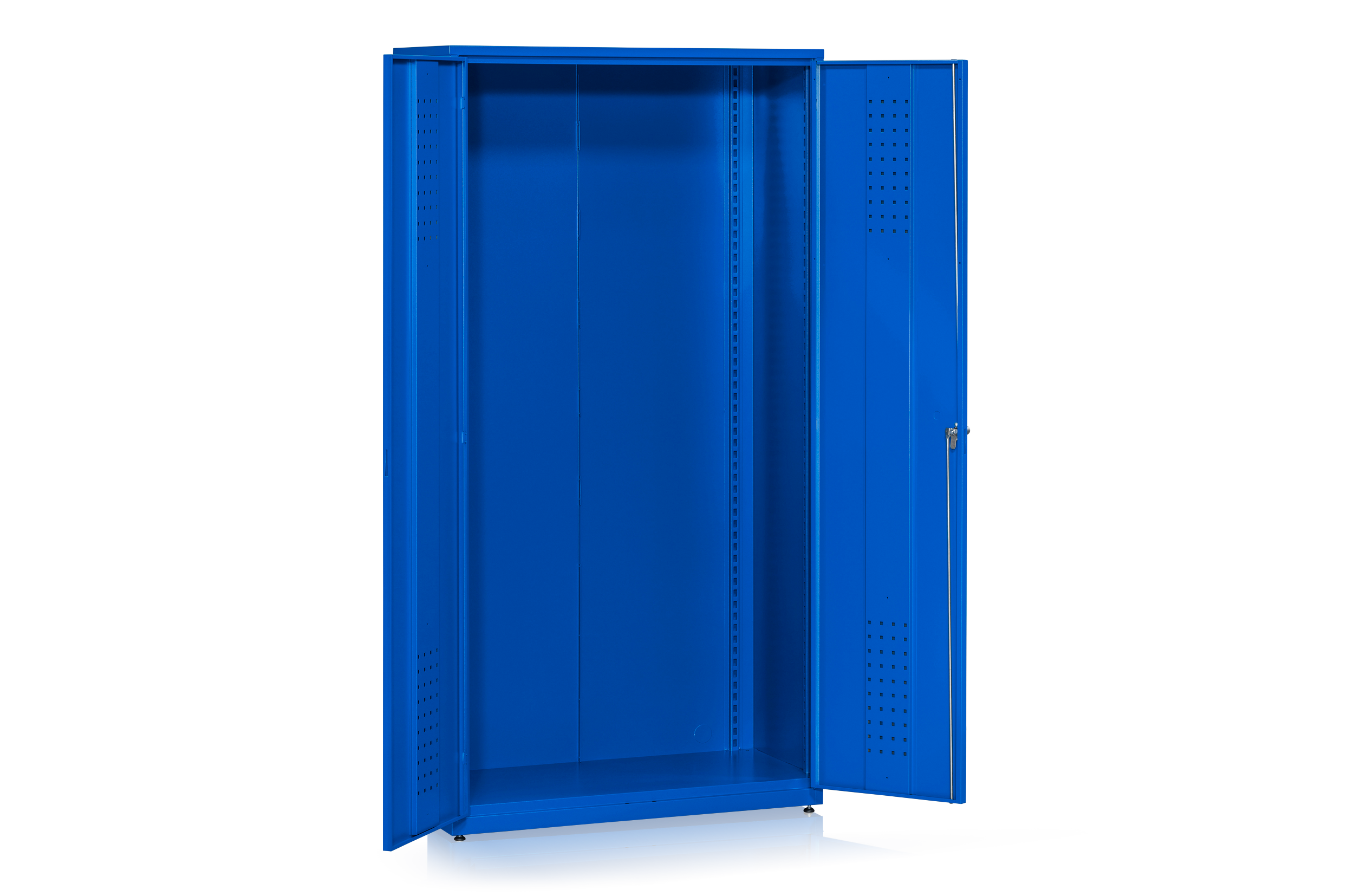 Skåpet passar utmärkt för industri, verkstad och lager. Dörrarna som låses på tre punkter är försedda med spanjolettlåsning. För högsta finish och kvalitet är skåpet pulverlackerat. Tillgängliga tillbehör att köpa till skåpet: lyftvagnssockel, verktygspaneler, verktygskrok, extra hyllplan och backar.